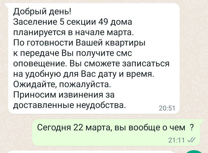 Наступило 1 марта - а ключи не получил никто. Менеджеры отдела заселения не скупились на ежедневное искусное придумывание баек из разряда: «нет договора с водоканалом; у нас все готово, но комиссия ещё не приняла то-то» и многое другое. Самое заманчивое, что информация о сроках доносилась до дольщиков в раздроблённом хаотичном порядке с жуткими несостыковками (менеджеры даже между собой не договорились: что вешать на уши людям).
