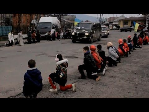 Дети по обе стороны коридора стоят в униженной позе – на коленях, с опущенными головами. В конце коридора виднеется портрет какого-то украинского лидера, под ним – лампадки, рядом - жовто-блакытный флаг. Над всем этим истеричный визг учителя: