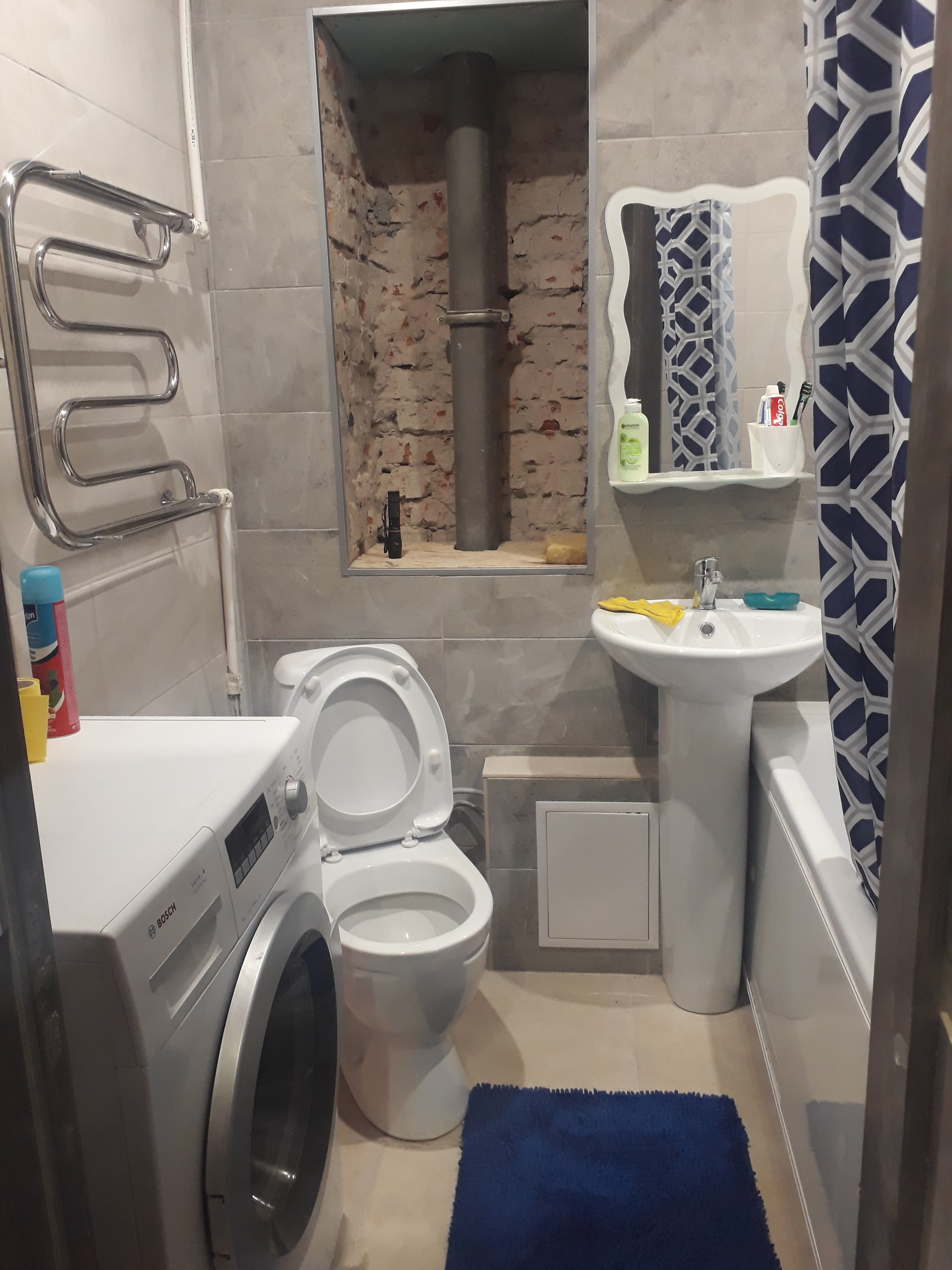 Ну и полез в предположительное место расположения стояка и труб у себя в ванной, к сожалению фотки до начала разлома я не сделал, но думаю суть понятна, какой там ремонт(особенно крипово было когда я заметил надпись "я рядом" над зеркалом и то уже на фотке 😀)