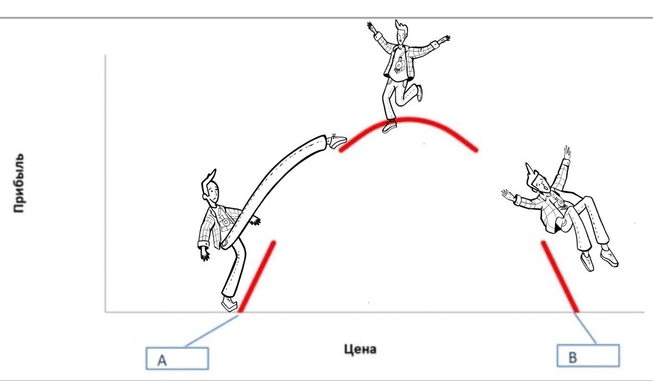 И если продажи равны нулю — то и маржинальная прибыль тоже будет равна нулю (точка B на графике). При цене между A до B продажи будут отличаться от нуля, а разница между ценой и переменными затратами на единицу товара будет положительной. И, значит, в этом промежутке мы всегда будем получать маржинальную прибыль. При увеличении цены, начиная от цены A, кривая маржинальной прибыли на нашем графике будет двигаться вверх. А в точку B график приходит сверху.