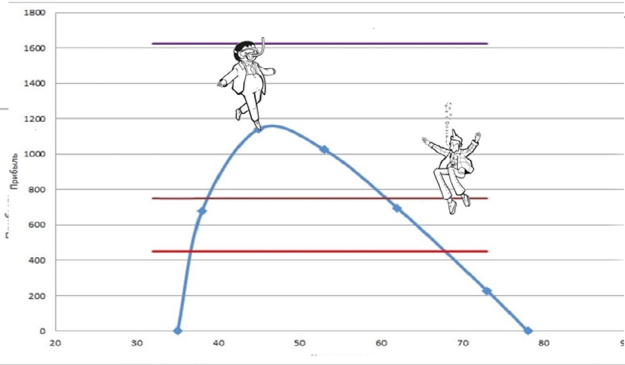 — Есть. Но постоянные затраты не зависят от цены. А это значит, что они могут быть изображены на графике как линия параллельная оси цены. Общая прибыль предприятия в этом случае будет равна разности между маржинальной прибылью и постоянными затратами.