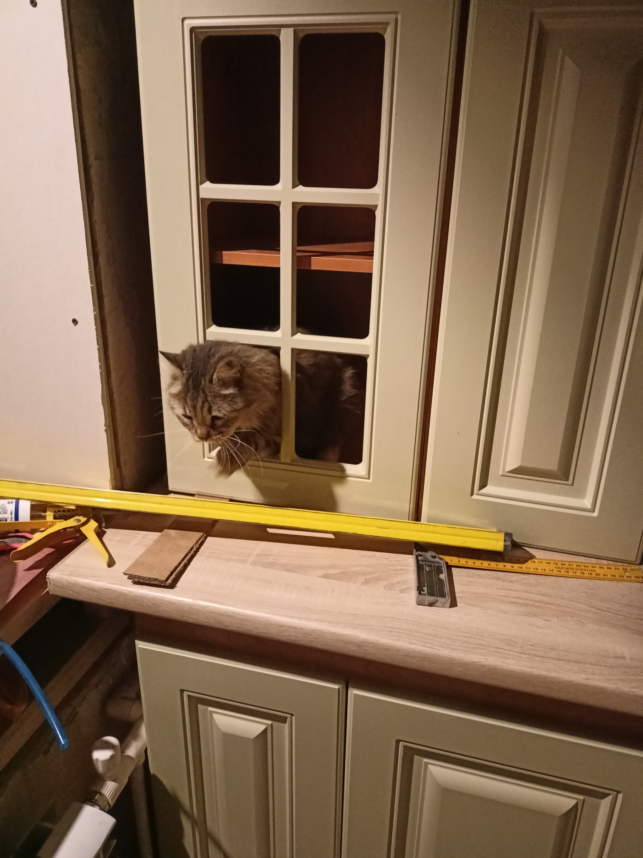 На фото - инспектирует сделанный хозяйкой шкафчик:"Сейчас уровень возьму, все полки проверю"