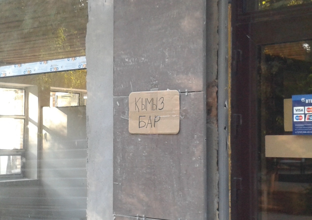 8 DELETED Затусуем, народ? 9 лет назад До сих пор в сомнениях, то ли это «Есть кумыс» на казахском, то ли реально «Кумыс-бар». [моё] Вывеска Казахстан Тараз