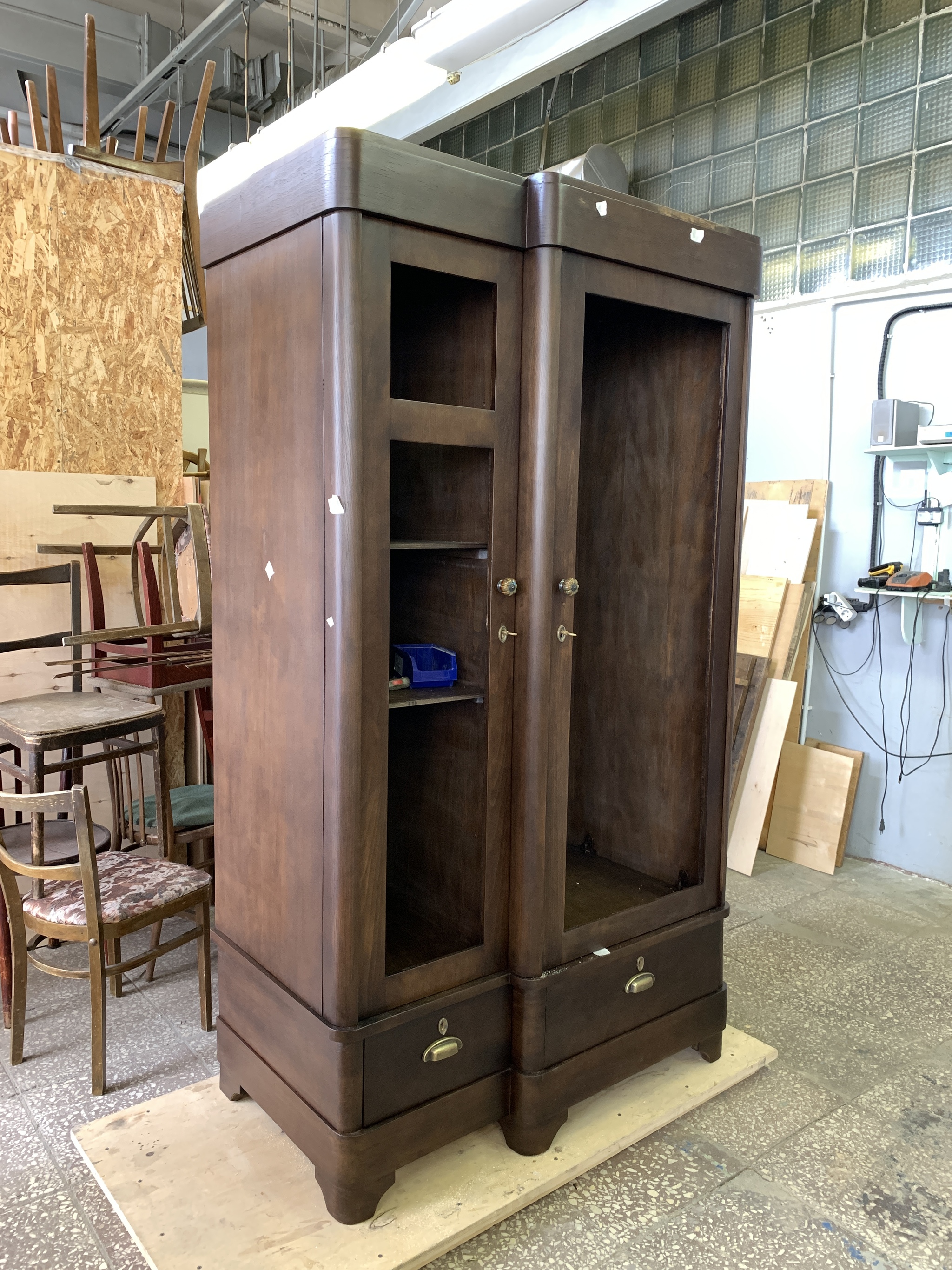 Этот шкаф хранился в неотапливаемом помещении, из-за чего на корпусе появилось много дефектов: повреждения от влаги, перепадов температуры, а также следы от грызунов.