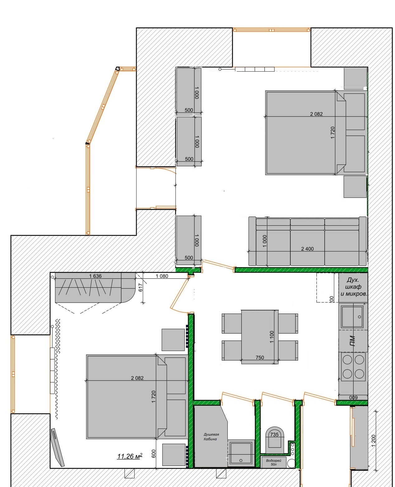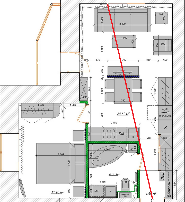 На бумаге все это выглядит логично и практично, однако в реальности недостаточно просто снести и поставить новые перегородки. Столь серьезное вмешательство в изначальную архитектуру квартиры неминуемо тянет за собой необходимость решать сложные задачи по перепланировке всех инженерных коммуникаций. Поэтому нам пришлось озадачиться переносом вывода вентиляционной шахты на новое место кухни, но это были цветочки по сравнению с проблемой, которая возникла в с/у. Поскольку дверной проем был перенесен на стену по которой были расположены канализационный и водопроводные стояки, убрать трубы в нее стало невозможно, и что бы вывести канализационный слив для ванной, нам необходимо было протащить трубу в обход, аж через три стены. И мы бы это сделали, но как оказалось строители расположили колено канализационного стояка на 12 см выше уровня стяжки пола, и получалось, что канализационный слив для ванной выходил на уровень на 10 см выше чем дно ванной, что намекало, что вода уходить будет очень плохо. И мы бы могли переделать канализационный стояк, но в квартире снизу уже был ремонт, а стояк был намертво зашит и выложен плиткой. В общем выбор был либо поднимать уровень пола во всей квартире см на 15, либо городить какой-то помост для ванной. И то и другое - бред. Пришлось собирать консилиумы из всех толковых сантехников в городе, и придумывать иной способ решения, в итоге придумали как врезать трубу прямо в 100 канализационный стояк, без отводов, а слив убрали в пол, под наклоном, аж плиту перекрытия пришлось выгрызать местами, но своего добились. Но порой вот такая тупость может тормознуть реализацию проекта на месяц а-то и больше. Но самое смешное произошло, когда уже на половине ремонта, заказчик вдруг озадачил нас совершенно сумасшедшим предложением сделать на лоджии сауну, я пытался его отговорить, но он прям этой идеей загорелся, в итоге я еще месяц подбирал спеца, который за это непотребство возьмется, и продумывал технические и финансовые аспекты этого сумасшествия. Благо все это уперлось в какую-то проблему (уже не помню) и так это и осталось всего лишь планами.