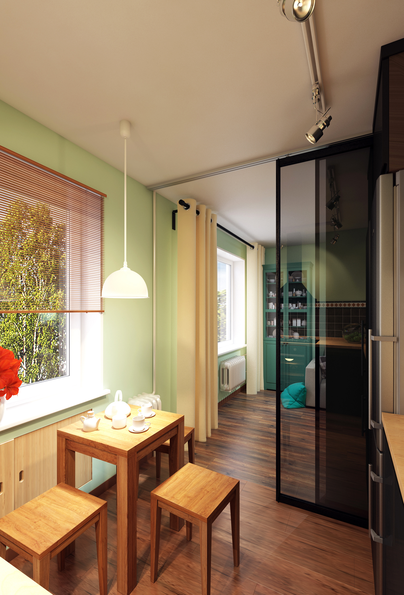 По задумке дизайнера, после работ по перепланировке, квартира должна была быть разбита на четыре отдельные зоны: 1.Прихожая - Кухня, 2.Ванная комната, 3.Гостиная и 4.Спальня. При этом, как я уже писал ранее спальня переезжала на кухню, на ее месте, после объединения с площадью коридора и прихожей, должны были появится кухня и гостиная, а вход в с/у у нас переносился на стену со стороны прихожей, зоны кухни и гостиной разделялись при помощи декоративной перегородки из бруса.