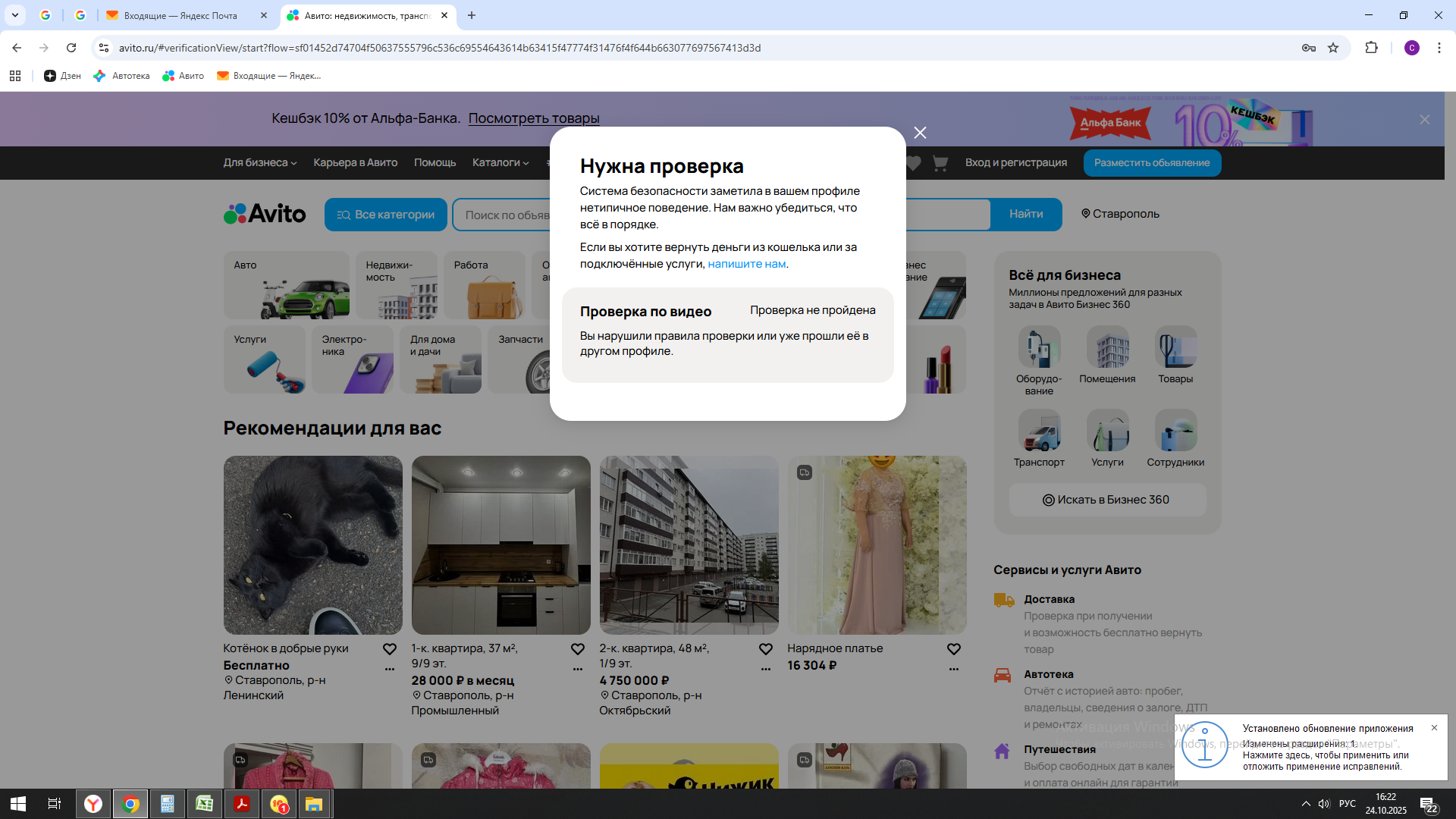 Сегодня при добавлении очередных объявлений ,столкнулся с ошибкой , профиль выбросило за пределы , а при входе просит пройти проверку .