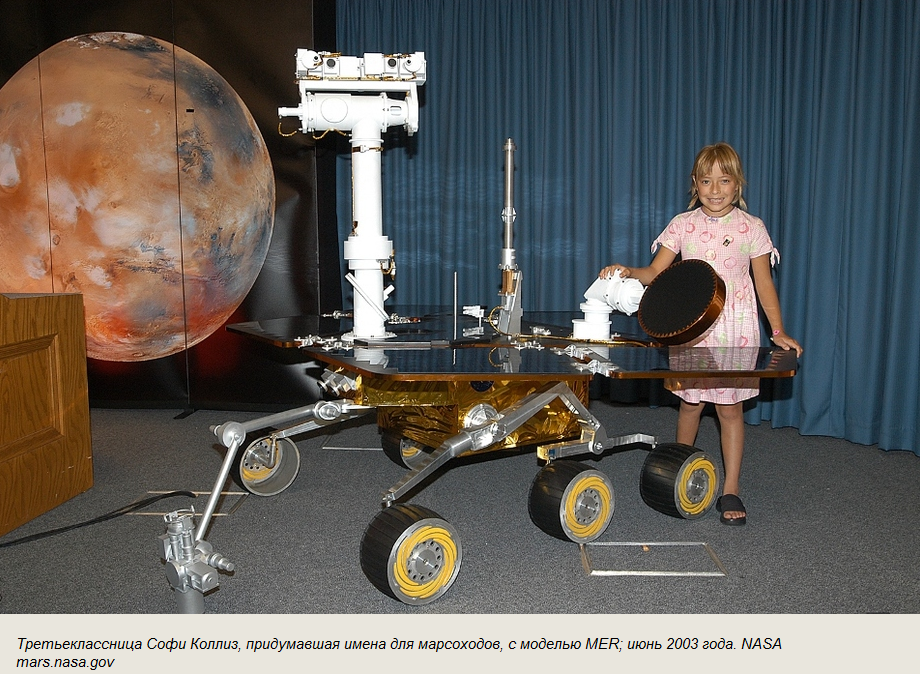 В том же ноябре NASA и LEGO объявили конкурс среди американских школьников от 5 до 18 лет, предложив придумать названия для роверов и до 31 января 2003 года прислать свои варианты. В конкурсе приняли участие около десяти тысяч ребят. 8 июня администратор NASA Шон О'Киф объявил имя победителя: им стала третьеклассница Софи Коллиз из Скоттсдейла (штат Аризона), назвавшая MER-A именем «Спирит» (Spirit, «Дух»), а MER-B — «Оппортьюнити» (Opportunity, «Возможность»). Интересно, что Софи по рождению русская, из приюта и была удочерена в возрасте двух лет.