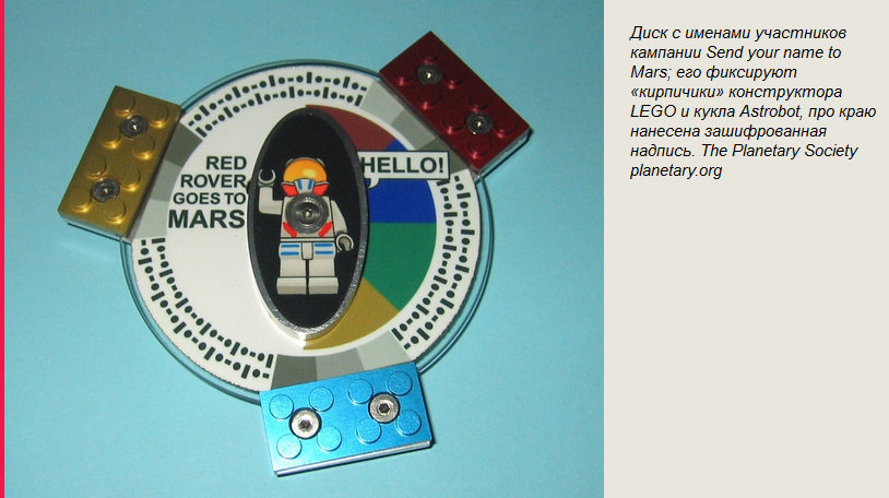 Такая «сувенирная» сборка весила 69 г и прошла испытания в экстремальных условиях, выдержав изменение температуры от −125°С до +60°С, воздействие вакуума, вибрации и перегрузок до 4000 g. Кстати, содержание «шифровок» позднее было придано огласке, чтобы те, кто взялся решать эту головоломку, могли увидеть, насколько приблизились к разгадке: на диске станции MER-A было написано «Wish you were here», MER-B — «Explore to learn».