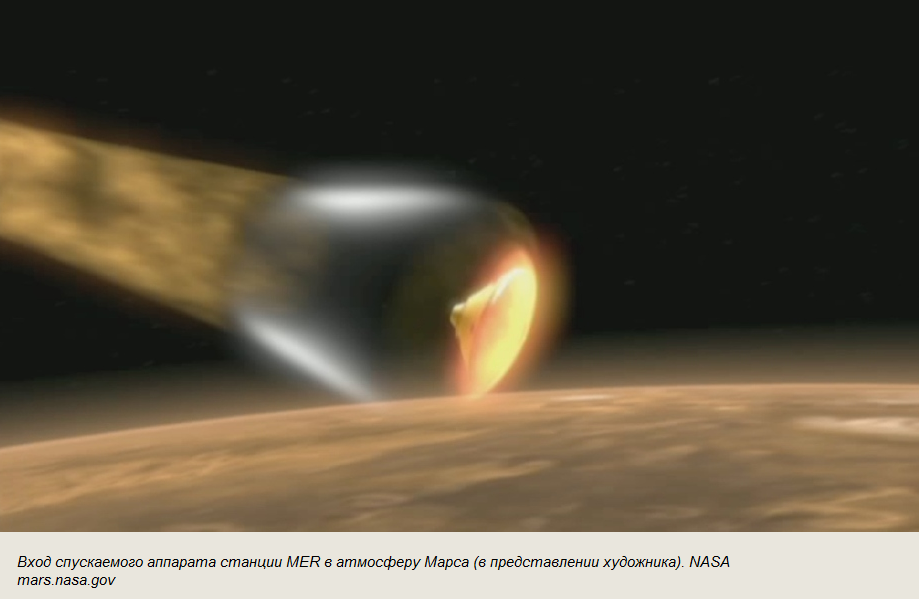 Станция MER-A первой прибыла к Марсу. 4 января 2004 года она развернулась лобовым аэродинамическим экраном вперёд, и на высоте 2200 км спускаемый аппарат отделился от перелётной ступени. Вращаясь, он вошёл в атмосферу со скоростью 5,4 км/с и за четыре минуты спуска погасил её до 430 м/с. На высоте 7400 м аппарат ввёл в действие пятнадцатиметровый парашют и отстрелил лобовой экран. За 8 секунд до касания газогенераторы надули подушки-амортизаторы до давления 0,07 атм. На высоте 100 м сработали тормозные твердотопливные двигатели: аппарат «завис» в воздухе, отстрелил хвостовой обтекатель с парашютом и устремился вниз.
