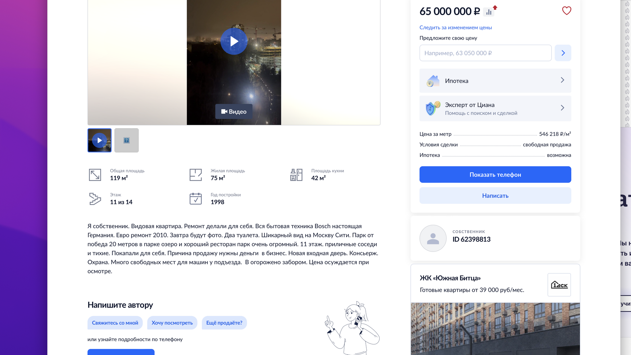 "Я собственник. Видовая квартира. Ремонт делали для себя. Вся бытовая техника Bosch настоящая Германия. Евро ремонт 2010. Завтра будут фото. Два туалета. Шикарный вид на Москву Сити. Парк от победа 20 метров в парке озеро и хороший ресторан парк очень огромный. 11 этаж. приличные соседи и тихие. Покапали для себя. Причина продажу нужны деньги в бизнес. Новая входная дверь. Консьерж. Охрана. Много свободных мест для машин у подъезда. В огорожено забором. Цена осуждается при осмотре."