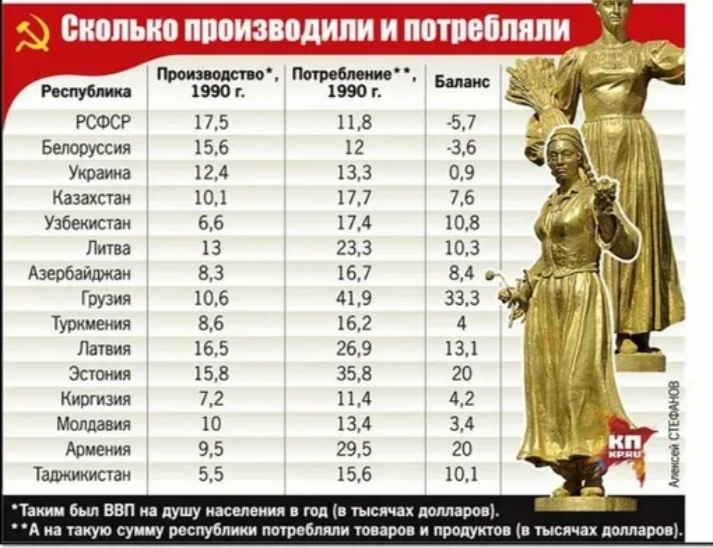 Фокус в том, что СССР не был государством имперского типа, где есть метрополия и окраины. Да и в таких государствах не бывает такого, чтобы окраина жила лучше метрополии. Не было в союзе такого, что какая-то республика работала и всех обеспечивала, а кто-то жил за чужой счёт и нихера не делал. Там все работали на общак и из общака же получали. Да и мобильность населения была большой. Люди из одной республики часто работали в другой. Тут как считать, кто больше сделал? Была история, что более отсталые среднеазиатские республики старались развивать и поэтому в них вкладывали в относительном выражении больше ресурсов. Но это вообще-то нормальная практика, это инвестиция в будущее. Потому что все были гражданами одного государства - советской страны.