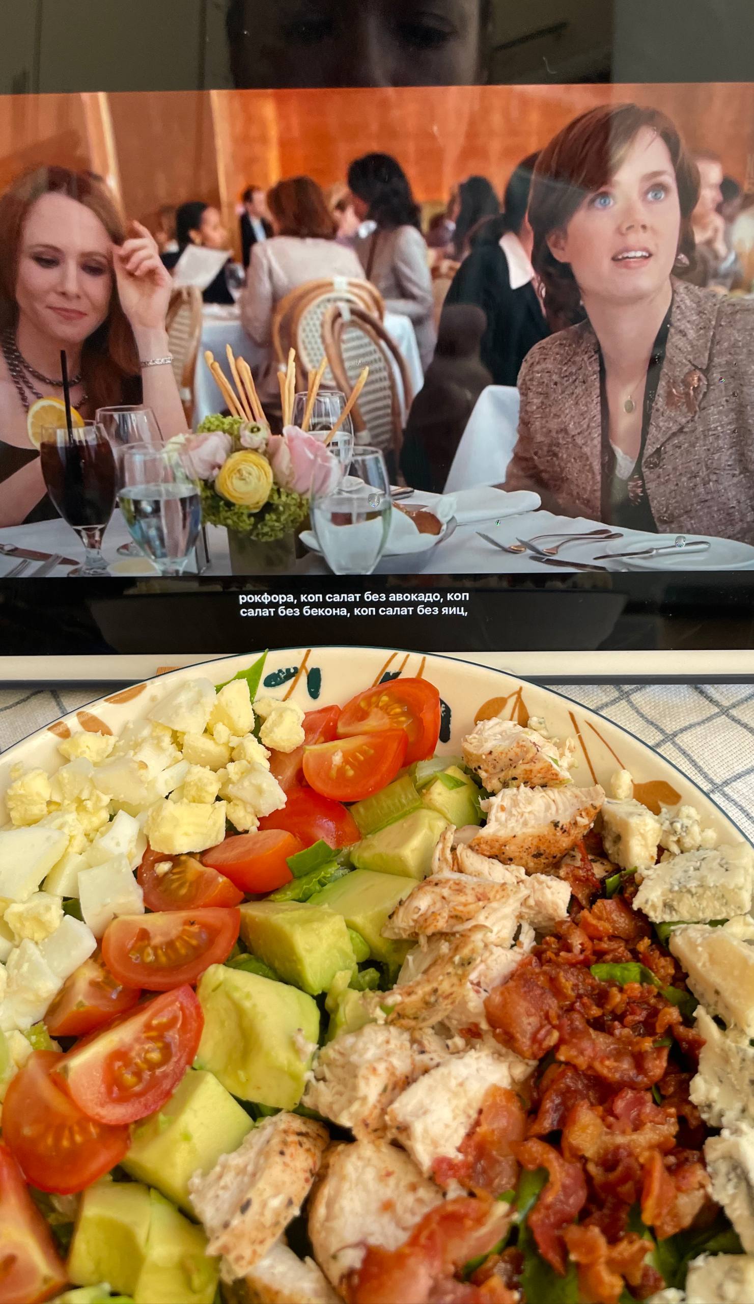 Кстати, приготовить #салат меня мотивировало не кино, а прекрасный сериал «Форс-мажоры» (который мы с мужем до сих пор смотрим) – в 6 сезоне Джессика Пирсон, не глядя в меню, заказывает кобб-салат. Стало интересно, а потом вспомнила, что он был в «Джули и Джулия…», в сериале «Сверхъественное» и, наверняка, ещё в многих других.