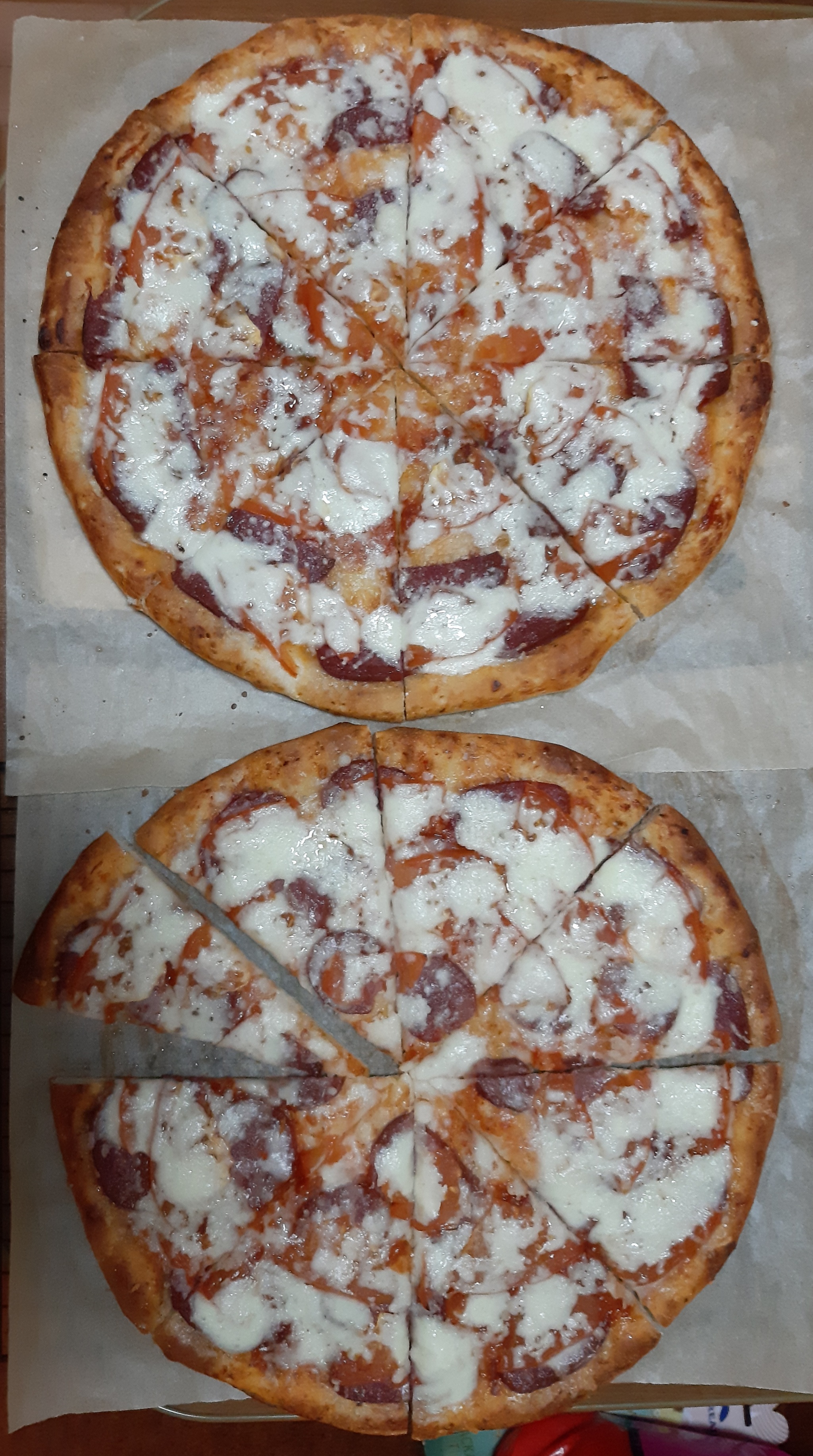Можно называть это произведение домашнего искусства моей супруги как угодно, но мы эти кругляши зовём по простому - пицца домашняя нажористая (это слово из лексикона шефа Ивлева). Эти 2 пиццы мне на 5 завтраков (3 кусочка на 1 раз). Разогреваю в духовке, храню в холодосе в упаковке.