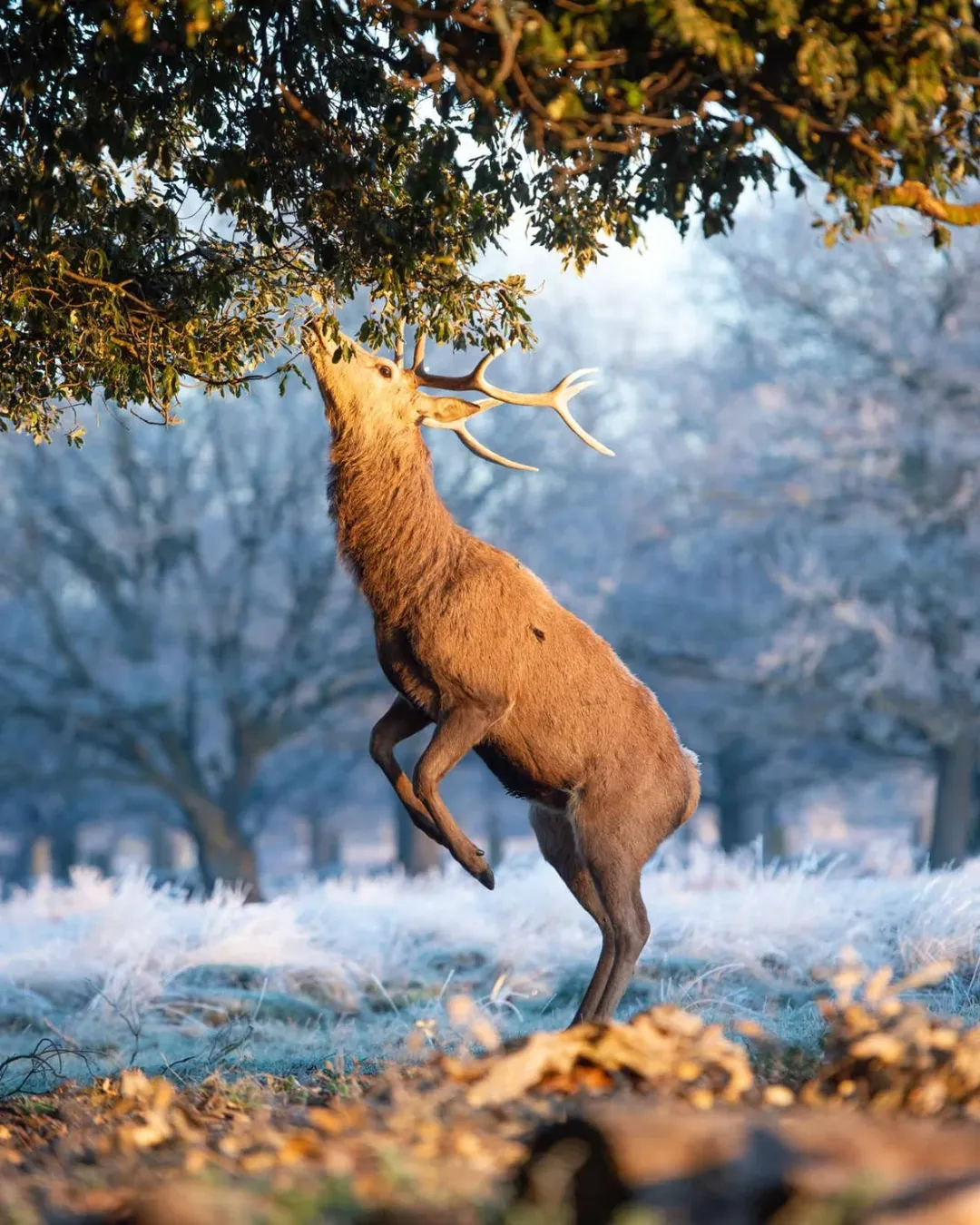 7 февраля 2026 года в парке Буши был замечен голодный олень, который завтракал под низко свисающими ветвями, потягиваясь и поднимаясь на задних ногах, чтобы дотянуться до листьев над головой. Залитый мягким зимним светом и окруженный заиндевевшей травой, олень чувствует себя совершенно непринужденно.