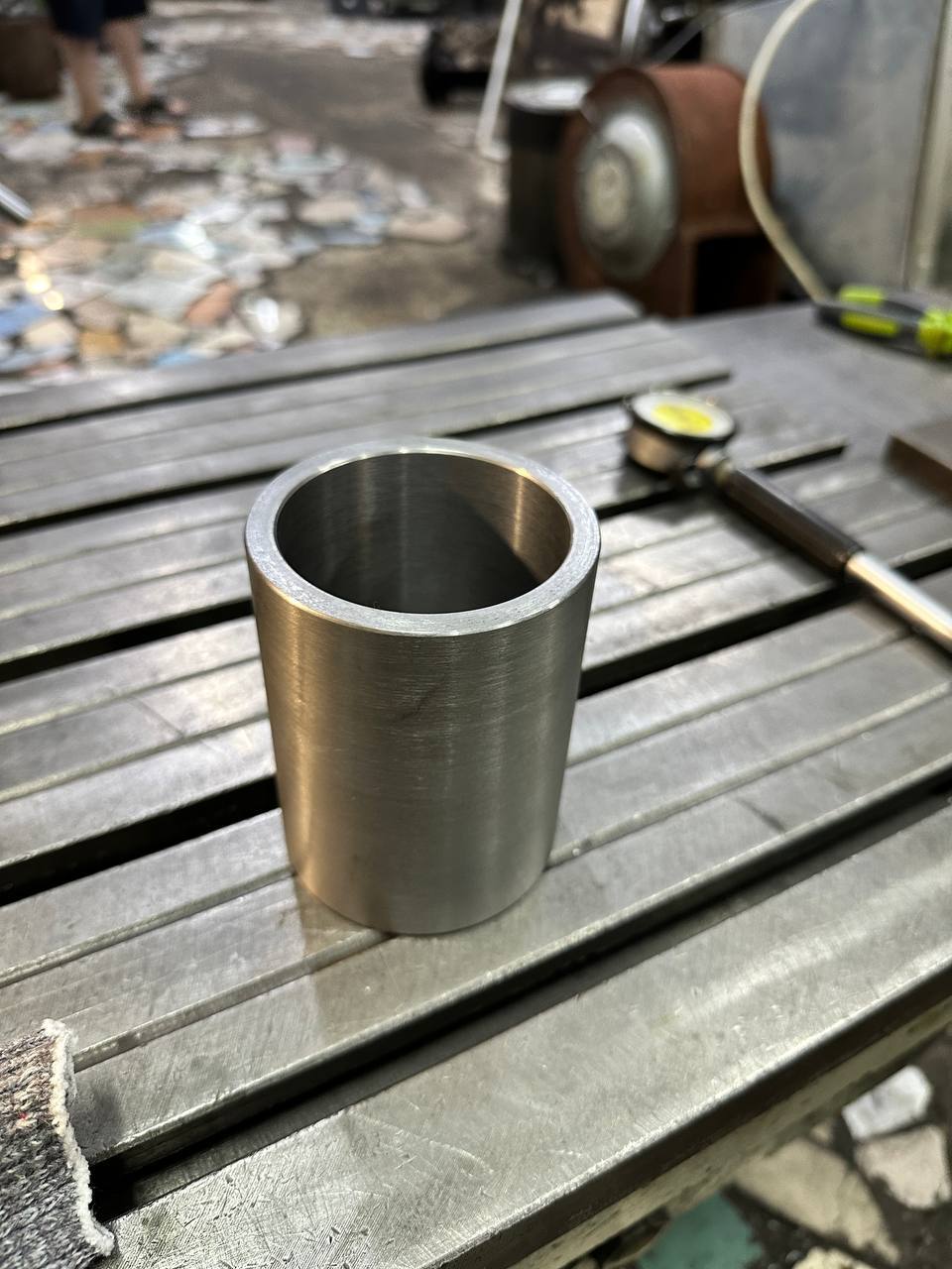Грею посадку, чтобы увеличить зазор и посадить втулку. До нагрева натяг составлял 15 соток, после разогрева зазор составил 30-35 соток. Втулка туда провалилась сама, немного подзабил кувалдой на всякий случай и оставил остывать.