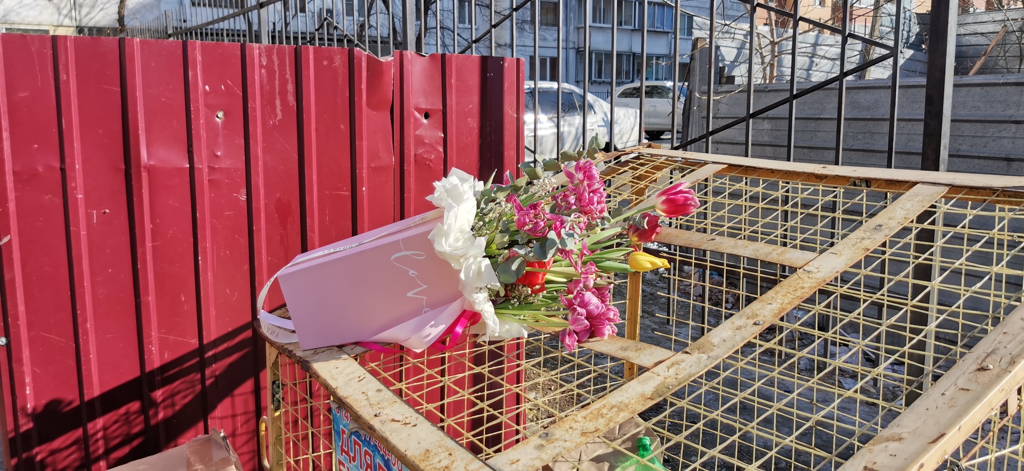 Надпись на упаковке: love (любовь). Цветы ещё в хорошем состоянии, но уже в мусорке. Что случилось?
