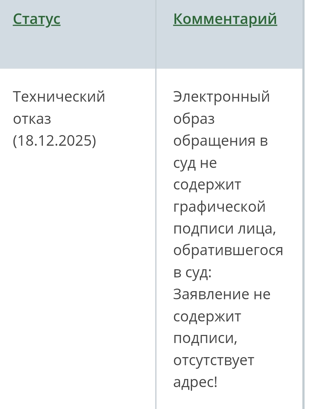 подал в суд возражение в электронном виде, подписал его с помощью УКЭП, но пришел отказ: отсутствие графической подписи и отсутствие адреса.