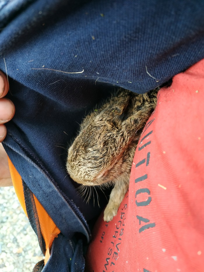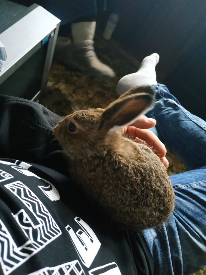 Кошу себе спокойно,никого не трогаю, и вдруг возле катушки замечаю шевеление...в сознании пронеслось: "змея"... Пригляделся. Нет, не змея. Нагнулся пониже, а это заяц. Маленький совсем))). Пищит, ползёт, и снова пищит. Зверь был срочно помещен в тепло и доставлен в вагончик.