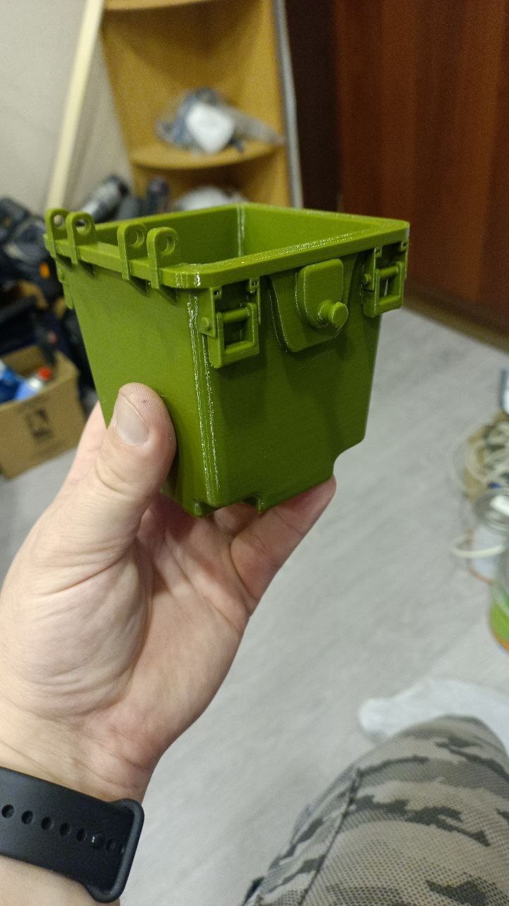 Проходил я как-то мимо мусорного бака и сфотографировал его, потому что мне понравилась форма. Ну и захотелось, чтобы такой же, но маленький, стоял у меня на столе. Ну, там мелочь всякую класть, или отходы при печати кидать, чтоб было, куда.