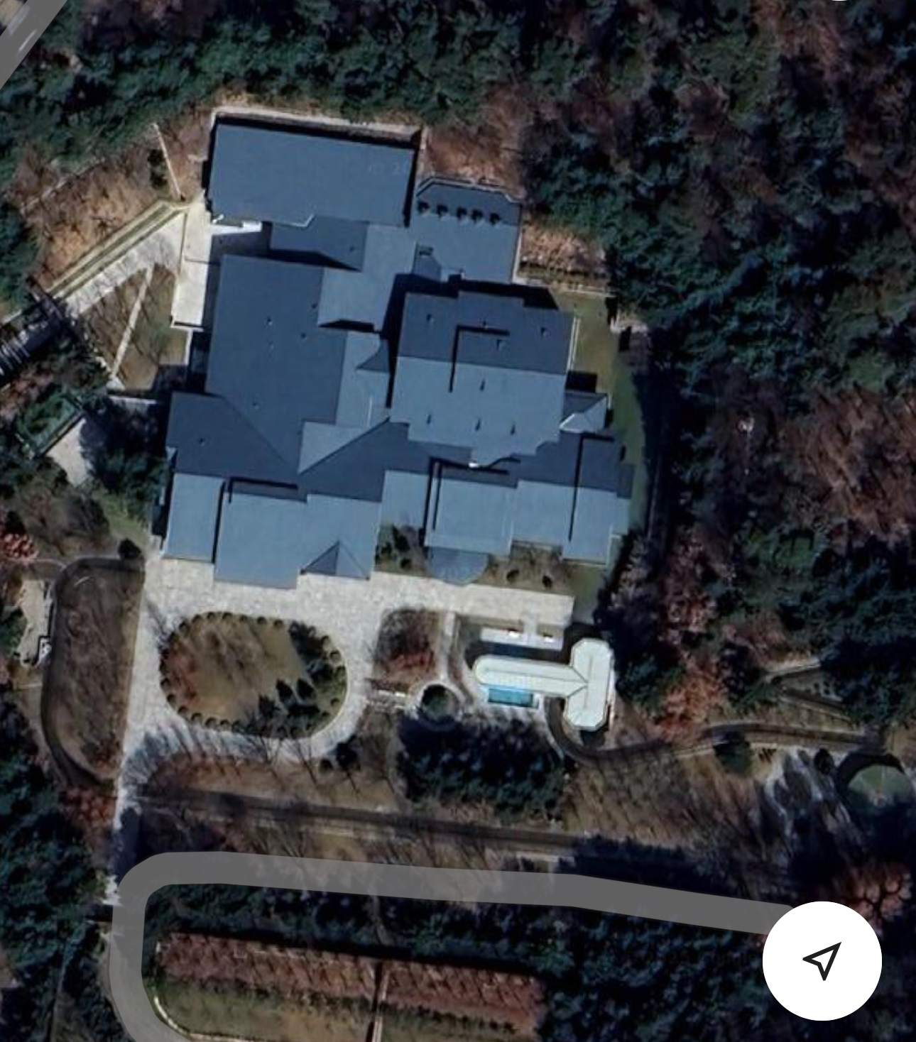 Тут видим красивый отдельный заезд ко входу, внутренний дворик. Крыша необычная, что-то между Азии и Западом. Такой же цвет крыши можете заметить справа внизу у беседки над водой.