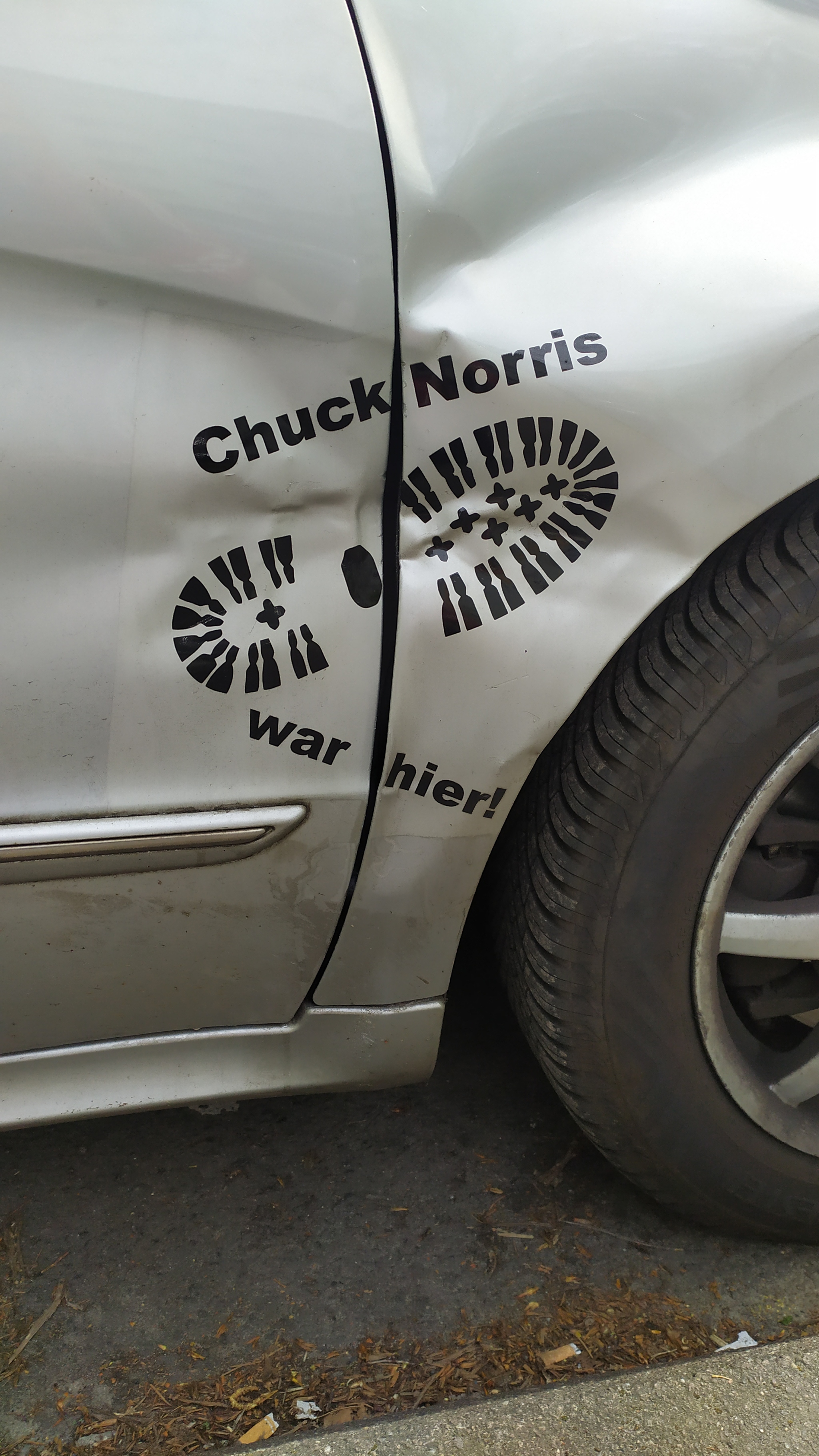 16 visualcomedy 3 года назад Здесь был Чак Норрис Прекрасное решение, не ремонтировать вмятину. Германия Чак Норрис Европа Немецкий язык Вмятина Авто 2 1 Ещё 0