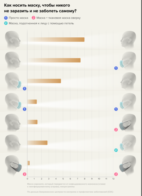 Маски задерживают и аэрозоли тоже. Это позволяет снизить вирусную нагрузку, что в свою очередь приводит к снижению вероятности заражения и заболевания в тяжелой форме.