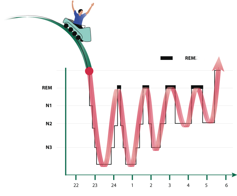 Фазы последовательно сменяют друг друга (N1 → N2 → N3 → N2 → REM), а циклы несколько отличаются друг от друга - постепенно снижается длительность глубокого сна (фаза N3) и увеличивается длительность REM-сна, последний цикл может содержать до 30-40 минут REM-сна.