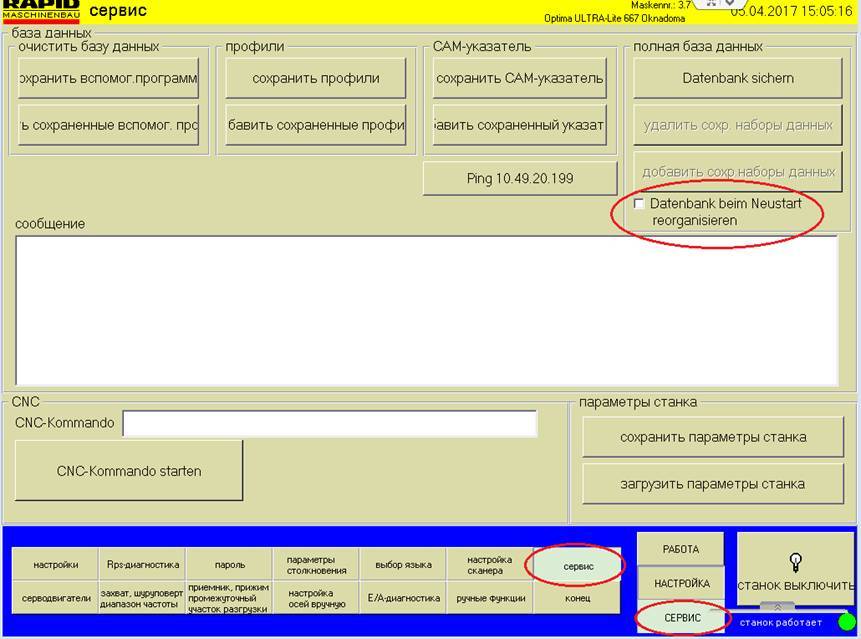 "Если поставить галочку в разделе „Datenbank beim Neustart reorganisieren“ (реорганизовать базу данных при каждом старте), то при каждом запуске база данных будет автоматически уменьшена. Делайте это по крайней мере раз в месяц, каждый день можно не делать. Учтите, что запуск после этого длится несколько дольше, надо будет подождать – не пытайтесь от неожиданности выключать/включать управление – просто ждите. Внизу картинка для иллюстрации, где галочку ставить." Вот это прислали по почте ставил галочку но станок так же загружается