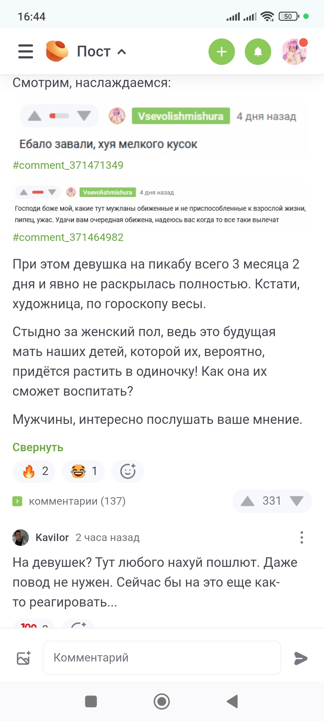 Дальше я часто стала замечать и ещё до регистрации замечала что тут очень много агрессии причем в том числе в адрес женщин. Меня это расстроило и я решила задать вопрос как другие женщины к этому относятся. Один мужчина написал отдельный пост об этом вырвав мои слова из контекста и выставив меня агрессивной, хотя я на многие оскорбления которые на меня посыпались либо не отвечала либо отвечала вежливо