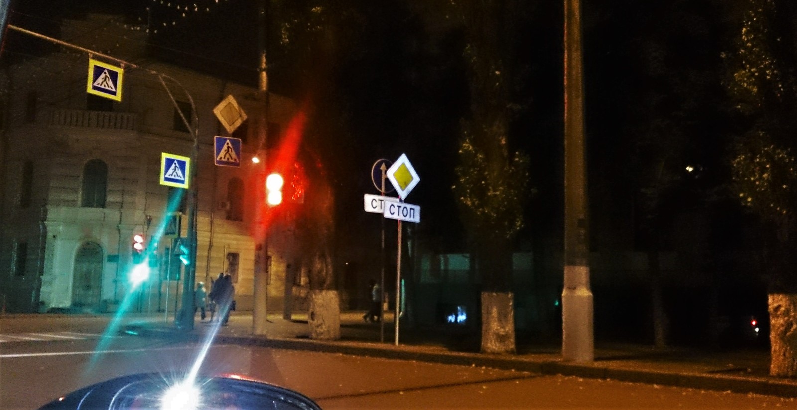 Расстояние между знаками метр, знак "главная дорога" перекрывает второй, если ехать по 1 или 2 полосе, то его будет не видно (мы стояли на 3 полосе), плюс прямо перед знаками дерево и столб. А знак важный, на этом перекрестке с недавнего времени запрещен поворот налево - встречка.