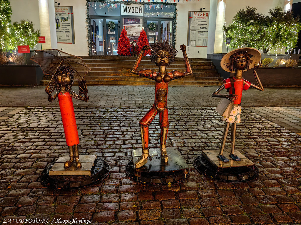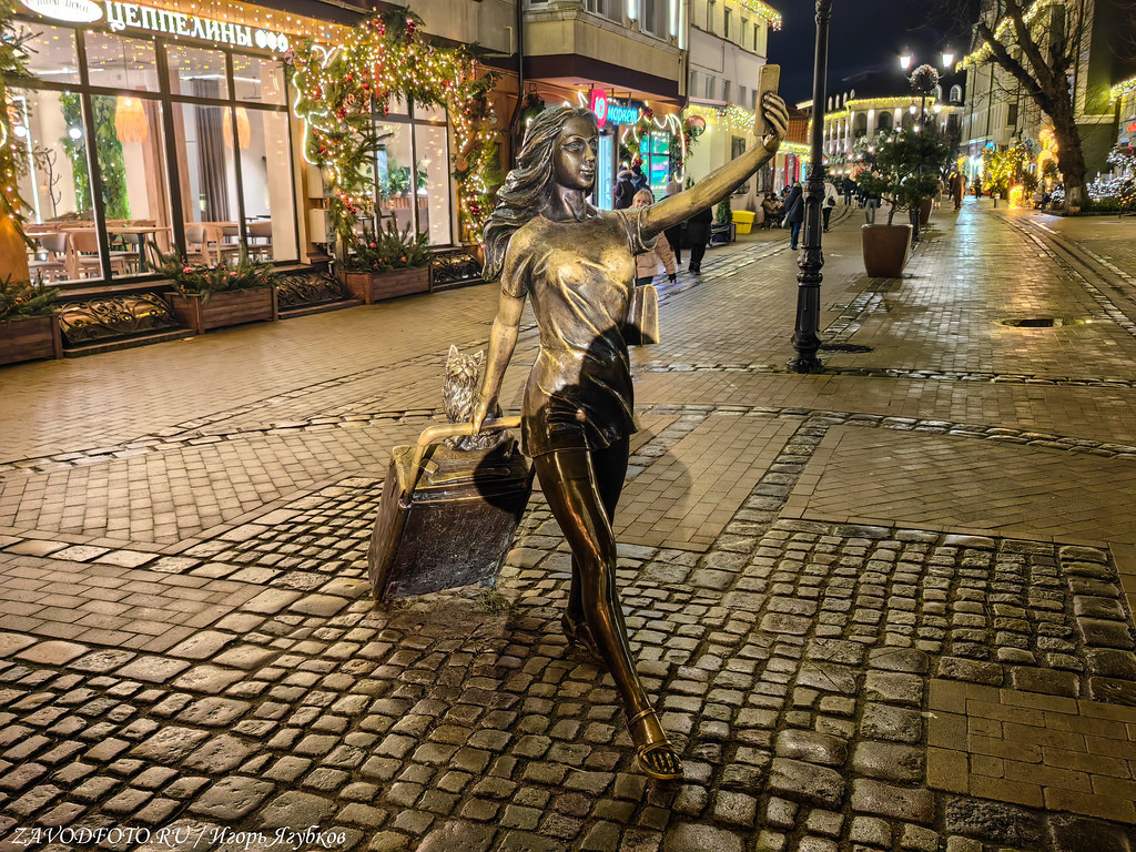 Памятник «Курортница». Скульптура представляет собой девушку, делающую очередное селфи и везущую за собой чемодан с примостившимся на нем зеленоградским котом.