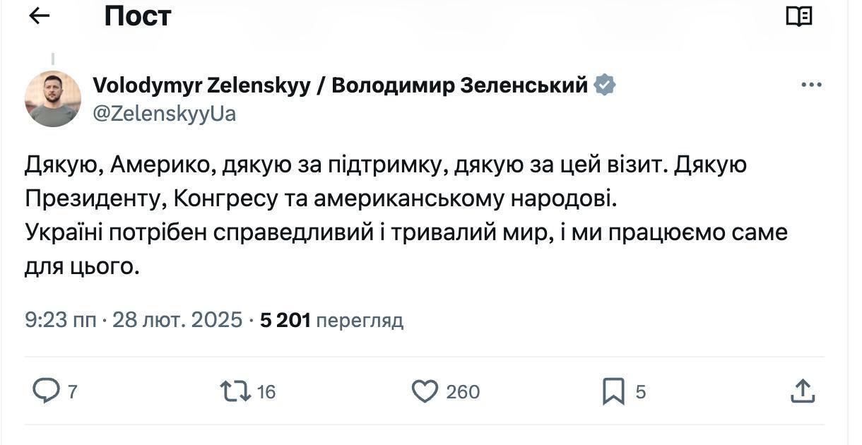 «Спасибо, Америка, спасибо тебе за твою поддержку, спасибо за этот визит. Спасибо президенту США Дональду Трампу, Конгрессу и американскому народу. Украине нужен справедливый и прочный мир, и мы работаем именно ради него», — написал президент Украины.