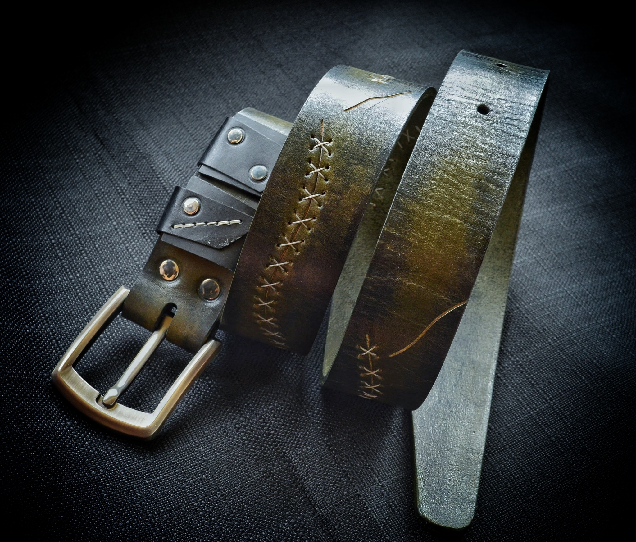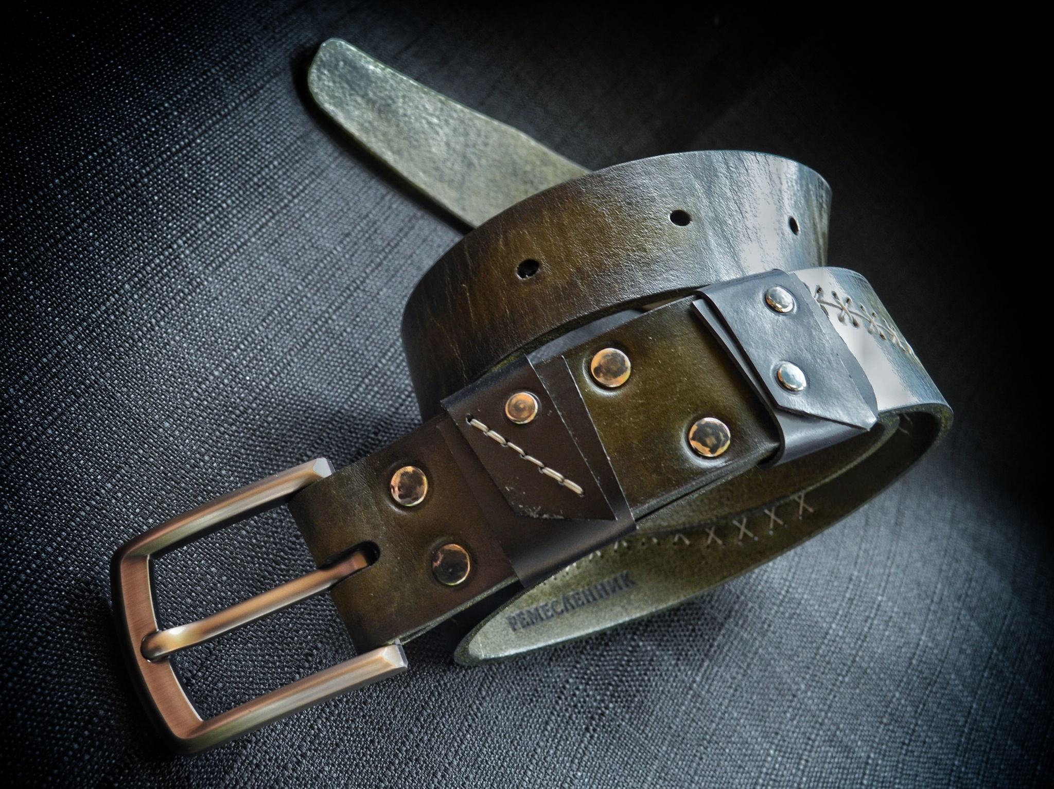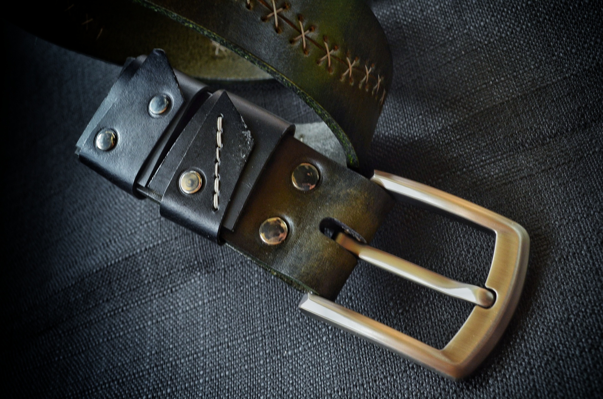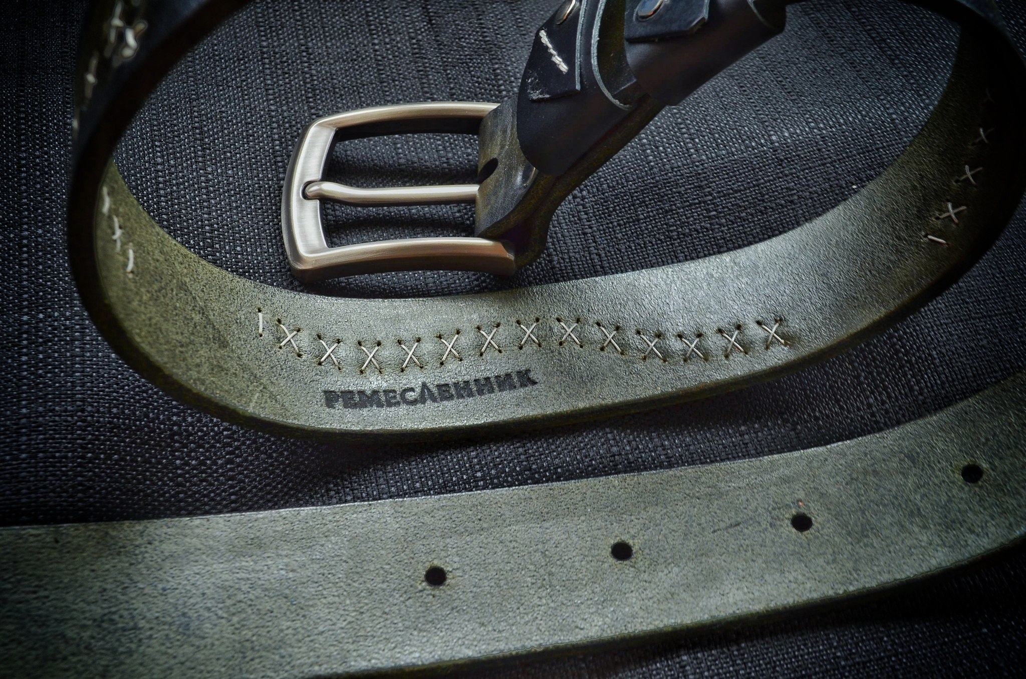Ремень из тёмно-зелёной кожи. Лёгкая тонировка по краям. Мелкие порезы на коже, большие порезы по длине ремня зашиты. Классическая пряжка.