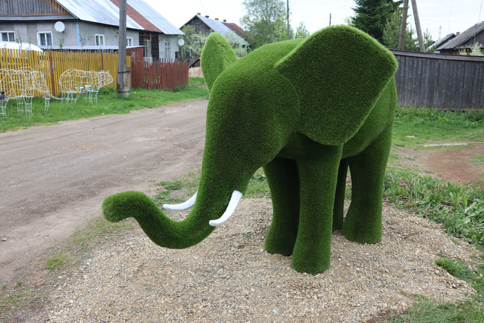 На заключительном этапе фигура оклеивается искусственным газоном. Название газона Topi Grass 40 (12000 dtex). Для этого газон режется на узкие полоски толщиной 3-4 см. Такие полоски приклеиваются на поверхность фигуры при помощи термоклея "Bosch".