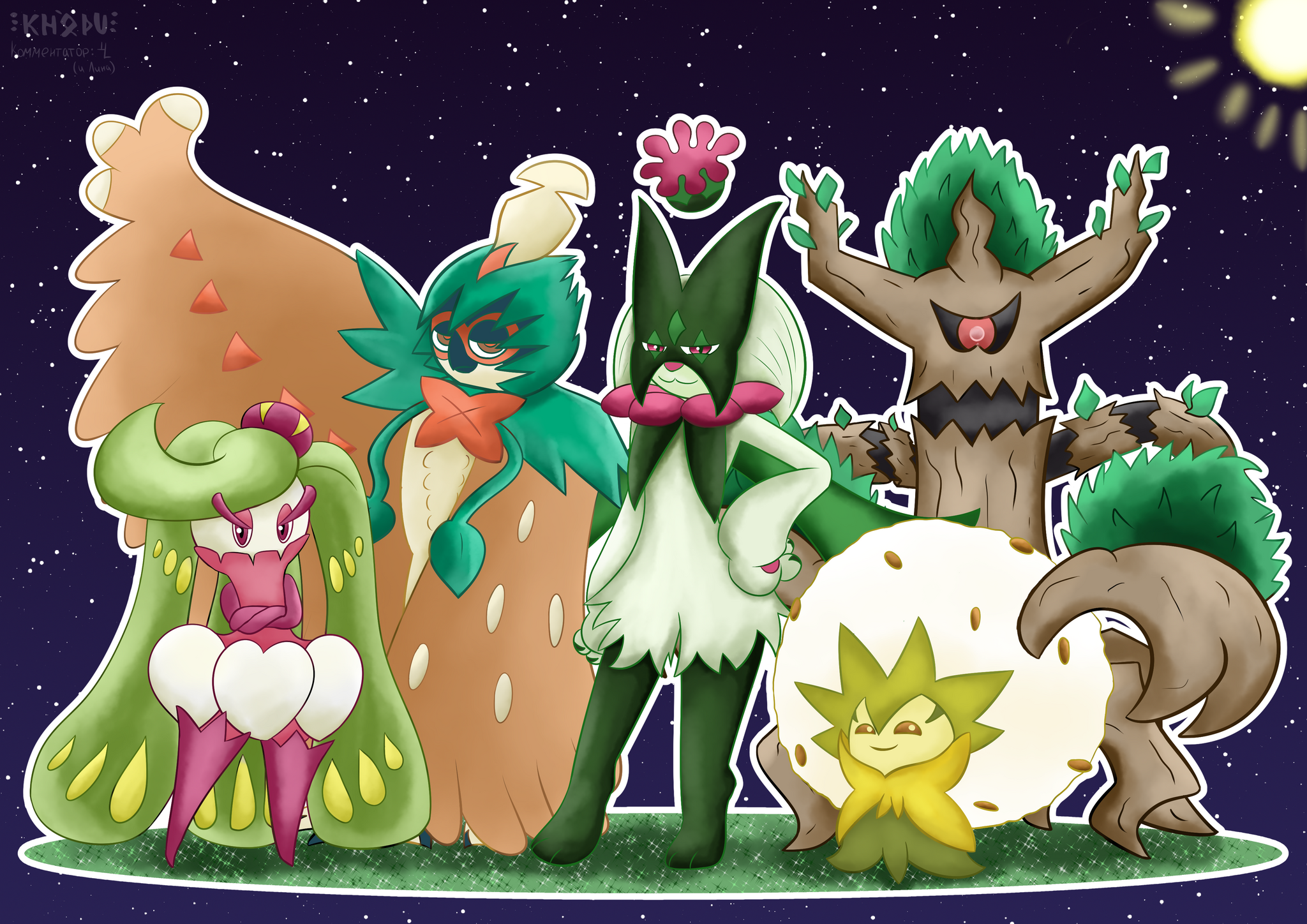 Немножко поясню, в чём суть. Арт сделан по игре Pokemon UNITE, это такая мобильная моба, где команды по 5 человек играют друг против друга. В качестве персонажей даются покемоны. На данном арте отображены все пять ролей: мяускарада - сверхбыстрый (центральная дорожка), царина - универсал (верхняя дорожка), с цариной идёт эльдегосс - саппорт (в нашем переводе ассистент), десиджуай - атакующий (нижняя дорожка) и с ним тревенант - защитник. При этом все покемоны травяного типа, а также прямоходящие. Это не особо важно конкретно в игре, но просто забавно было собрать их вместе)