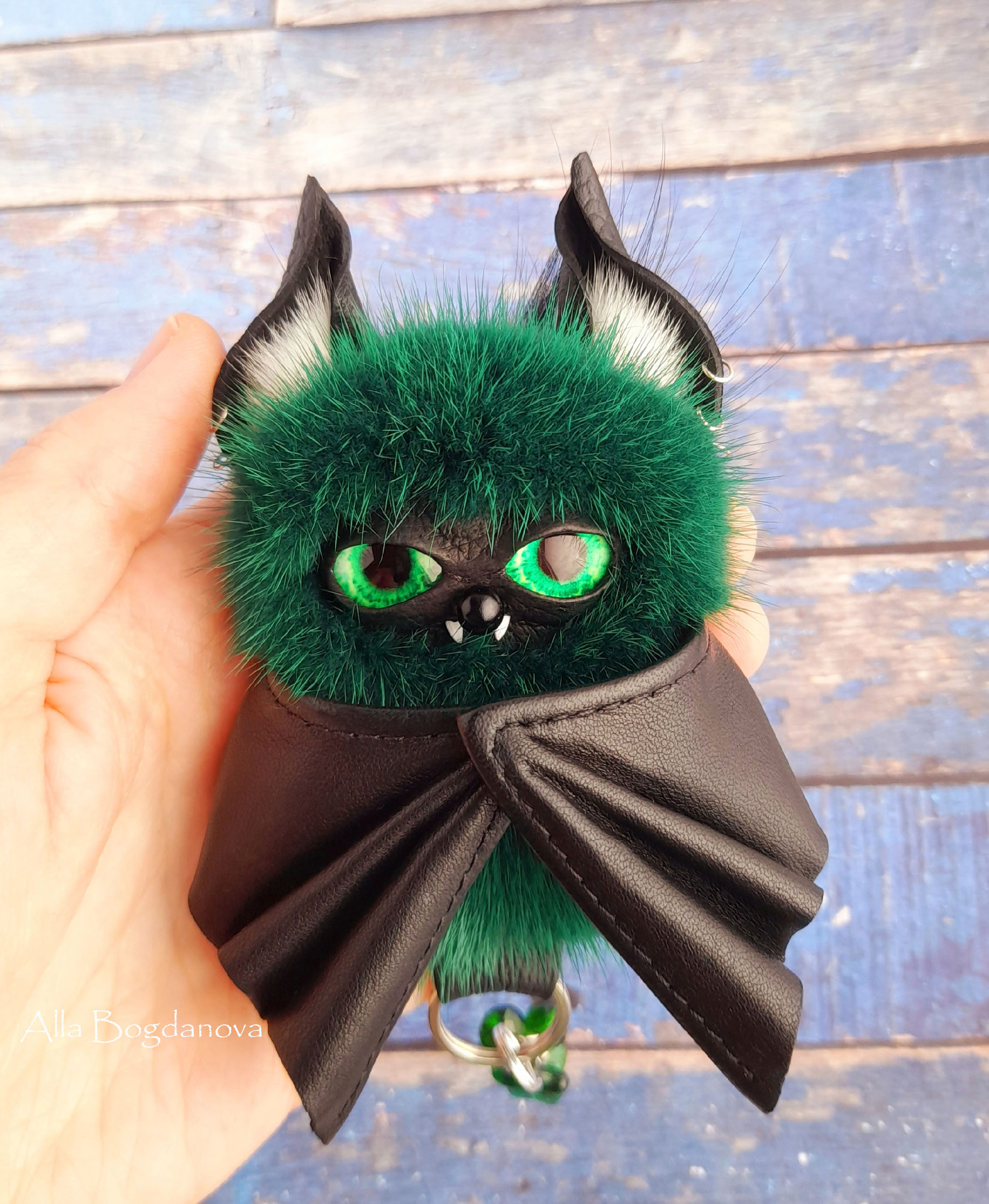Приветствую! Сегодня покажу мышку, которую сшила на заказ в прошлом месяце. Нужно было непременно из меха зелёного цвета, глазки подобрала тоже яркие, светло-зелёные. Стеклянные бусины в цвет и потом добавила к ним металлическую подвеску в виде гитары. Мышка для девушки любительницы рок-музыки, поэтому ирокез и серьги в ушах) Крылья подвижные, на проволочном каркасе, размах около 15 см. Длина тела вместе с ушками около 10 см. В таком цвете это единственный экземпляр, повторять не планирую.