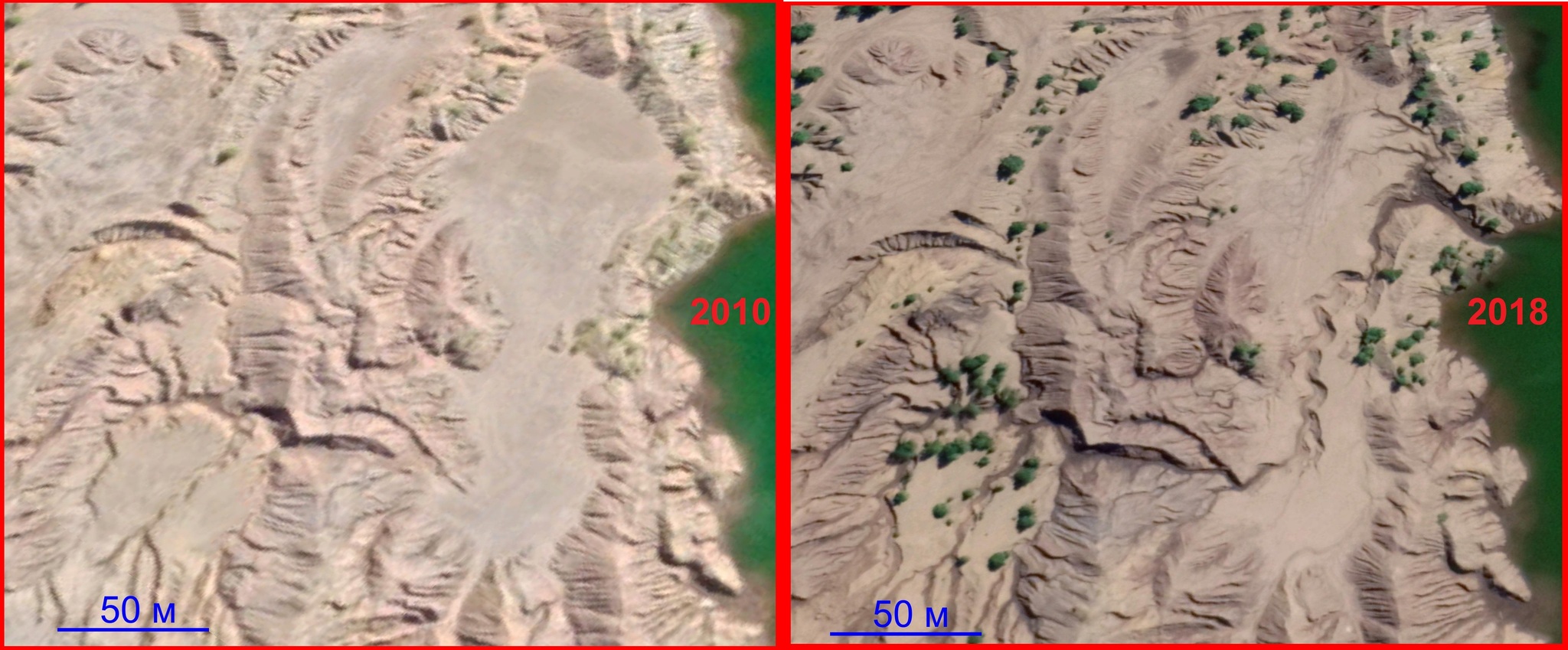 Человек не постарался убрать за собой все как было, поэтому Земле самой приходится устранять следы его жизнедеятельности. Делает это она как умеет - кропотливо по песчинке переносит насыпанные человеком горы обратно в карьеры. Ниже пара спутниковых снимков за 2010 и 2018 год.