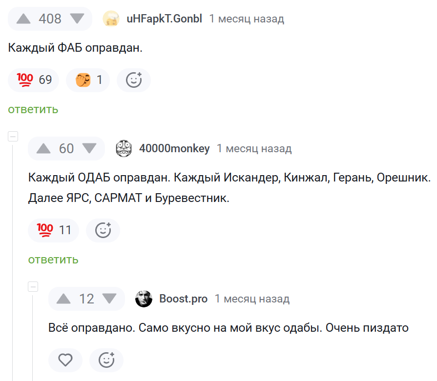 Так возникает эффект зеркала. В одном инфополе звучит «каждый ФАБ оправдан», в другом почти мгновенно рождается «каждый беспилотник оправдан». Реальное действие перестаёт быть событием — оно превращается в элемент морального уравнения, в котором ответ заранее известен. Такая логика снимает ответственность: оправдание встроено в саму структуру фразы.