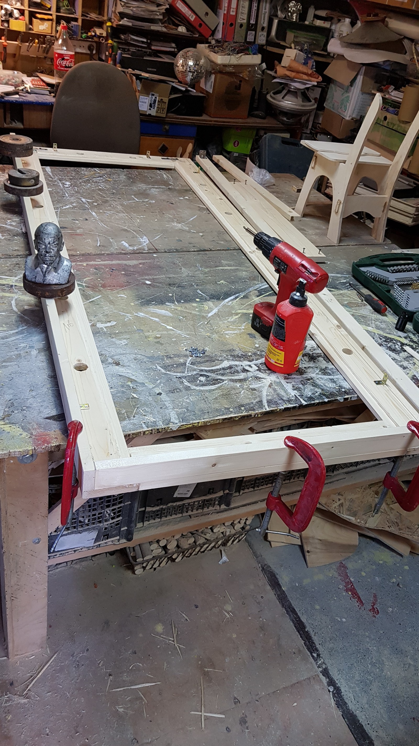 Далее разборка и проклейка всей рамы. Использовал клей ПВА, струбцины и грузы, чтобы держать раму.