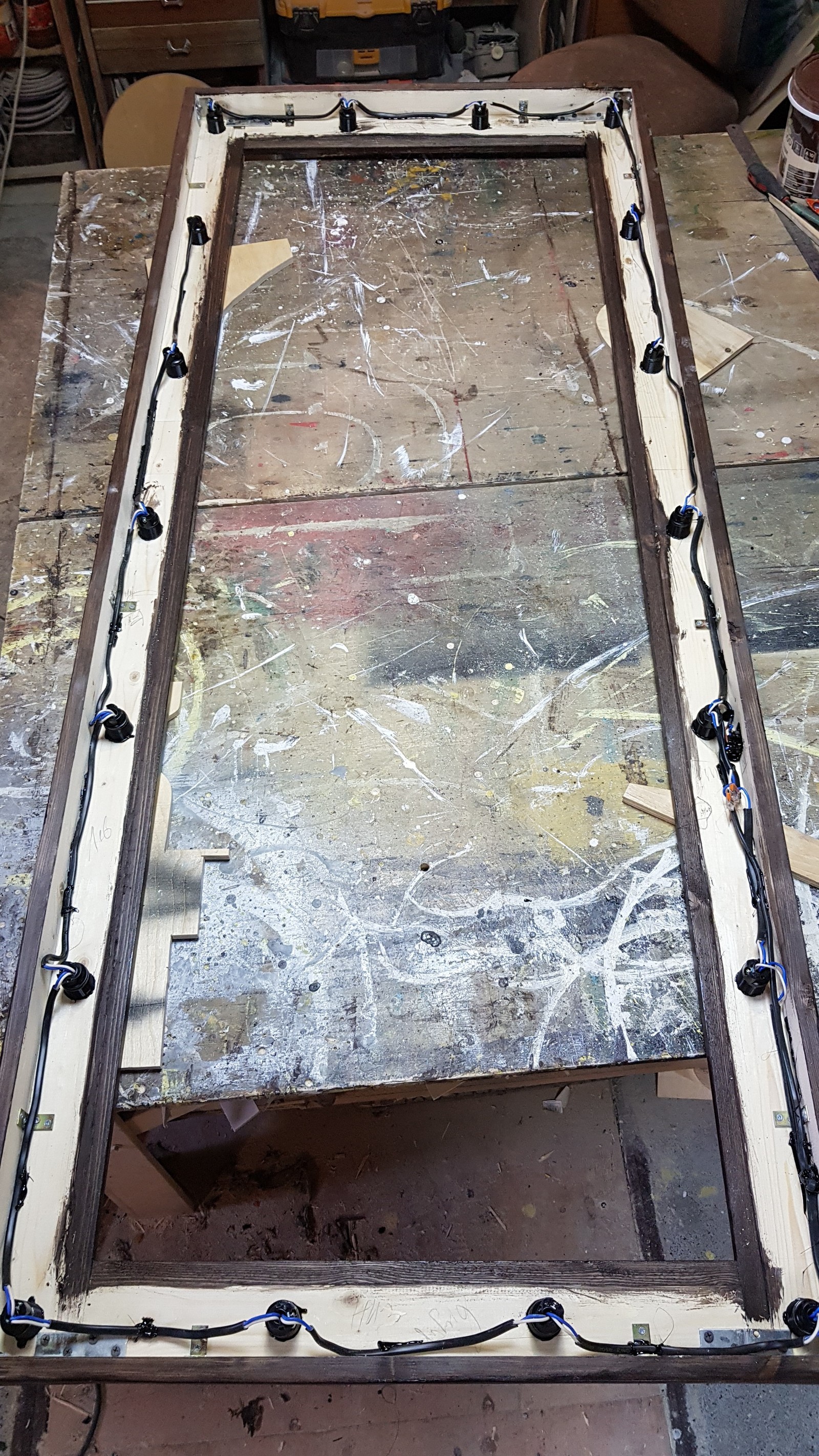 Доска по середине одновременно выполняет две функции, она держит зеркало на месте. Плюс придает жесткость раме (чтобы она не играла). Дополнительно сделал небольшие пяточки из дерева и саморезами прикрутил по граням зеркала, чтобы притянуть его к раме. На этом очередной рабочий день закончился. Очень хотелось перевернуть зеркало, но клей схватывается сутки, по этому на ночь пришлось оставить так.