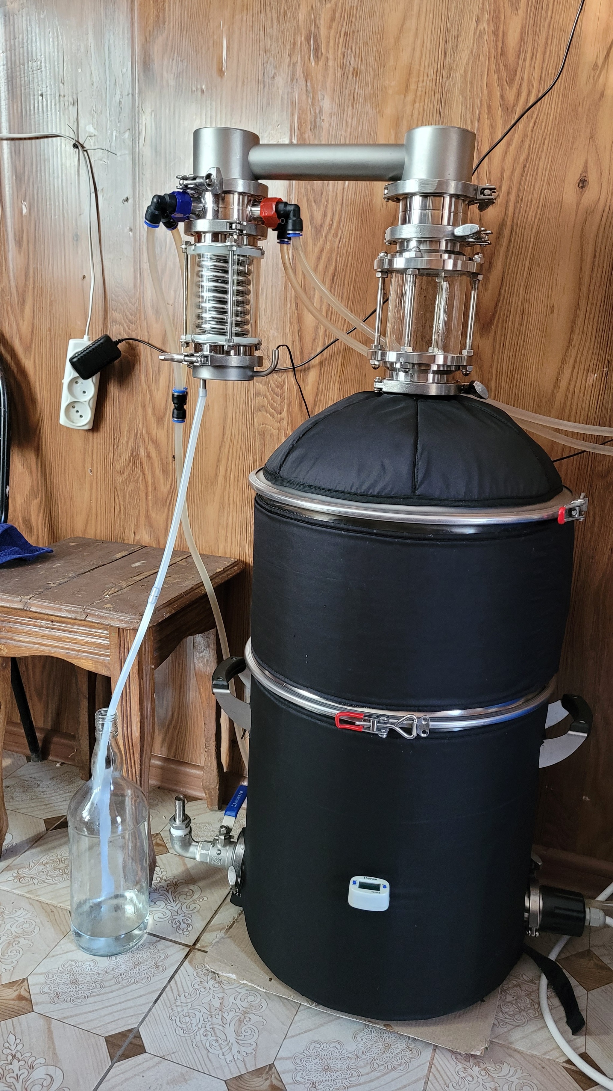 Отобрать головы в расчёте 4% от общего объема в кубе, назовём это Т1.1. Т.е допустим с 10 литров нужно отобрать 400 мл. У меня с 14,5 литров по расчётам получается 580 мл. Здесь и будет основная доля изоамилола и других нехороших гадостей.