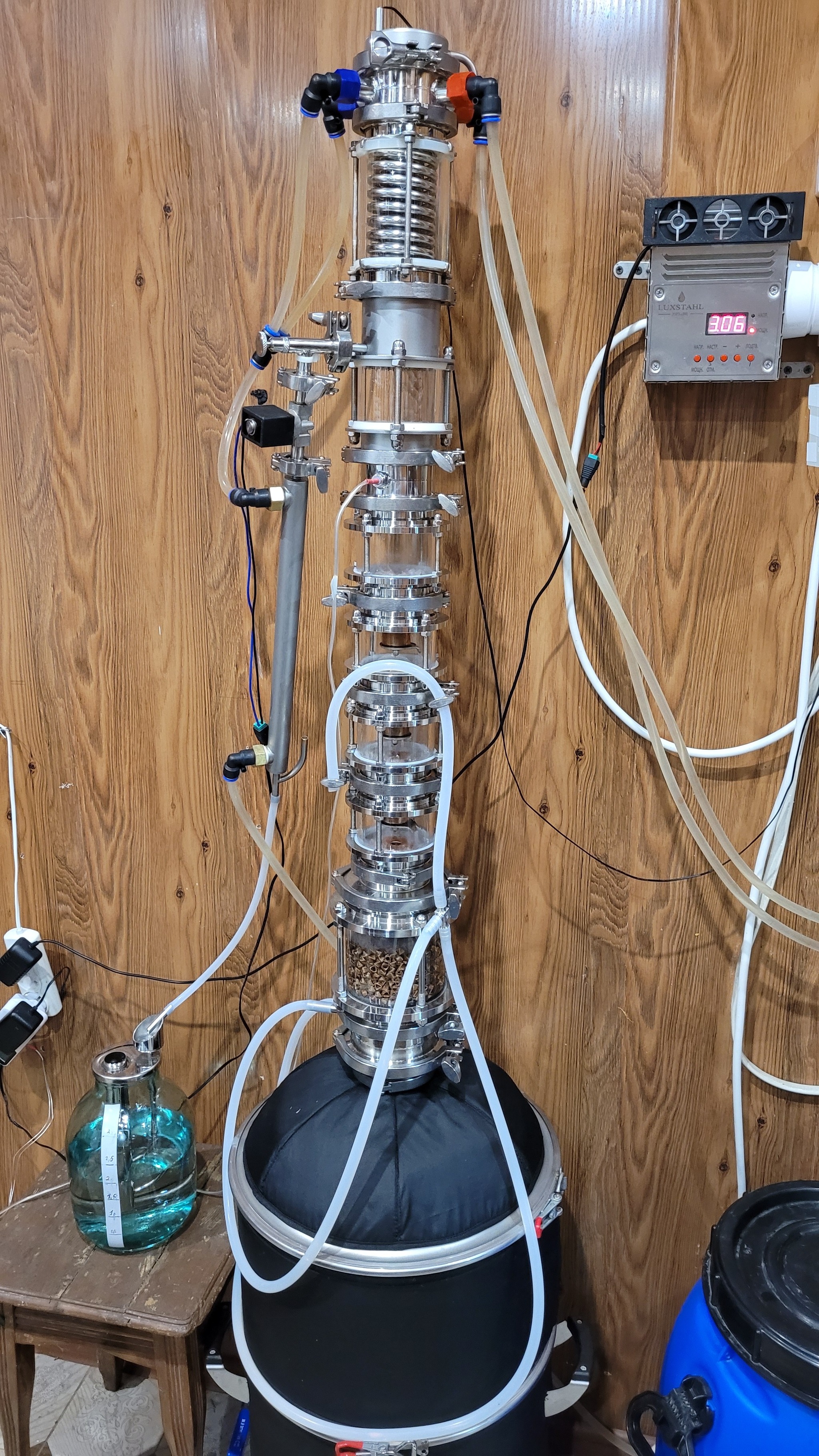 В моём случае перегон прямотоком в 20 см. царге находятся 2 медных РПН. Головы 20-30 мл. чисто для промывки аппарата. Тело гнал до 63% в струе на мощности 1,2 кВт. Остальное перегнал почти до нуля, буду копить до приличного объёма и отправлю на ректификацию.