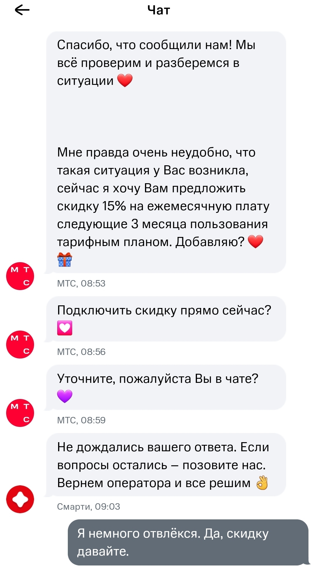 Порадовала реакция МТС. Не знаю накажут ли как-то звонящего, но скидка это всегда приятно. Не знаю, чего многие недовольны этим оператором? )))