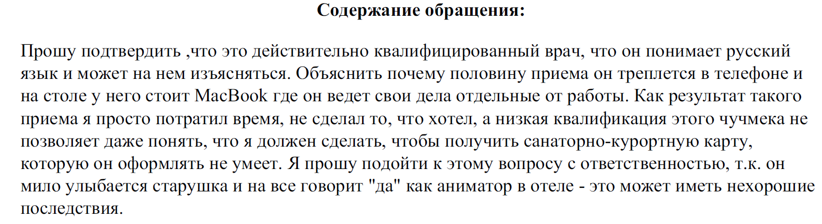 О чем все? О том, что этот пациент, 40 лет от роду, прогуливаясь по городу, ни за что не подошел бы и не сказал врачу, что он чучмек. Пациент совершенно безнаказанно решил оскорбить врача по национальному признаку и задать вопрос Правительству, потому что подумал что врач плохой. Оценивая лечение, которое назначал этот врач, и то как он пишет протоколы, можно смело сказать, что его работа оценена как выше на голову других врачей-старожил с опытом. В таких ситуациях врач, ознакомившись с жалобой, имеет полное право подать на пациента в суд за унижение человеческого достоинства, и он этот суд выиграет. Сам пациент даже не понимает, что принцип недопустимости экстремизма сработает бумерангом.