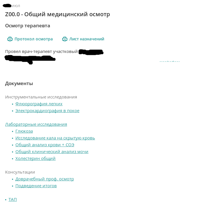 Проверяем амбулаторную карту этого пациента. Месяц назад он был у врача, на которого жаловался. Направлен на диспансеризацию. Пациенту назначен первый этап диспансеризации. Протокол осмотра без орфографических и смысловых ошибок.