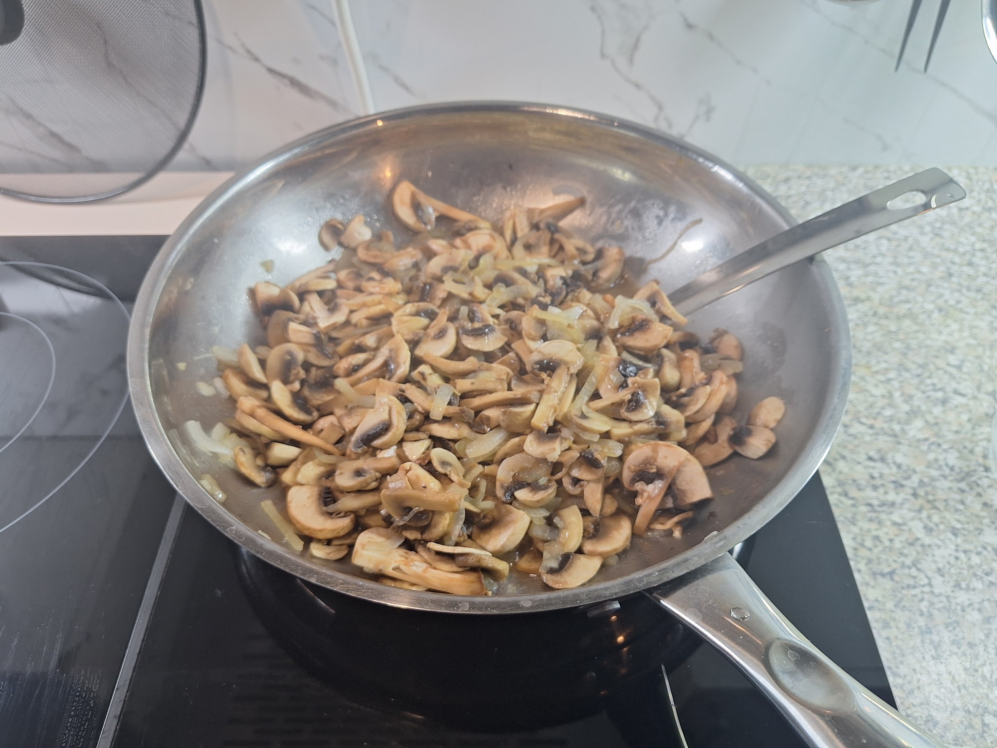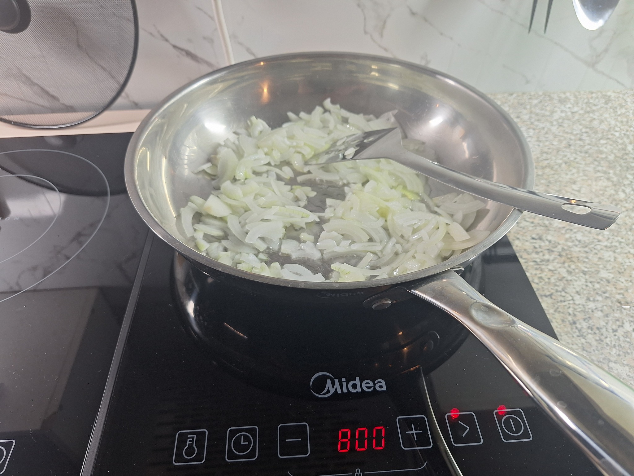 Включил нагрев ниже среднего, чтобы шкварчало аккуратно, без брызг и сильного подгорания.