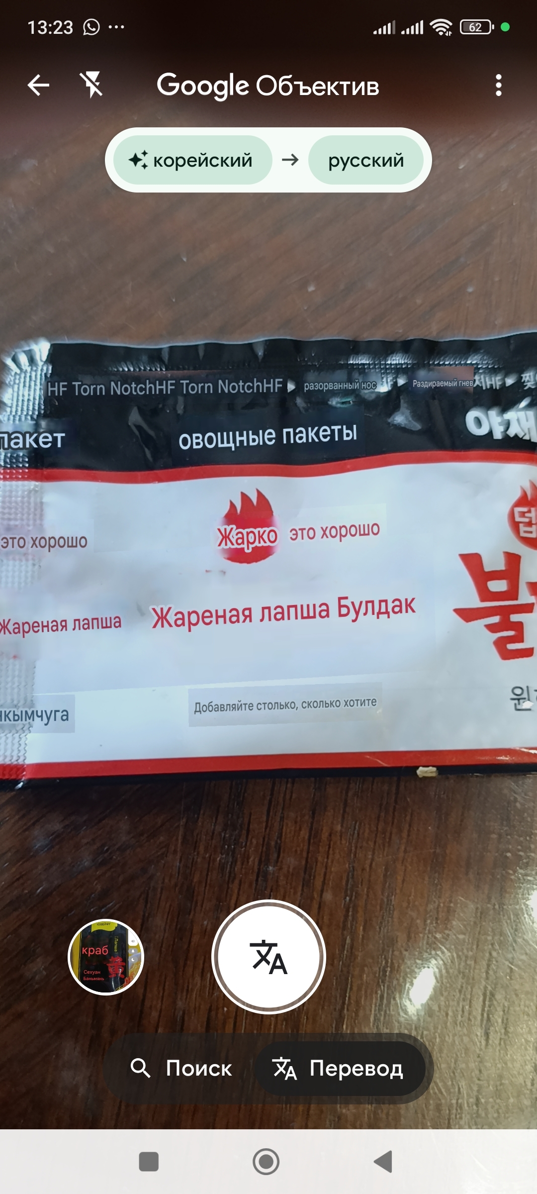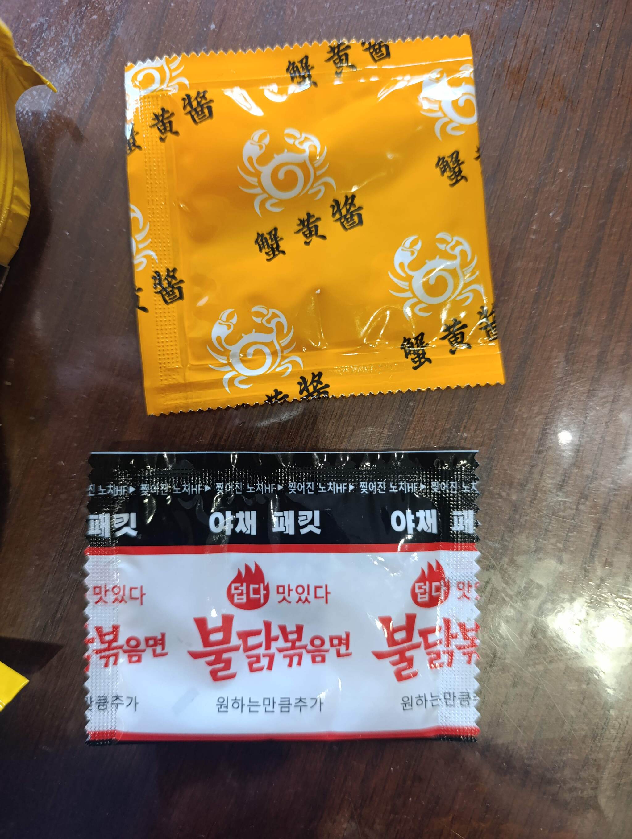 Переводчик говорит, что это желтый соус из краба и "жареная лапша булдак овощные пакеты жарко это хорошо, добавляйте сколько хотите". Наверное, что-то острое...