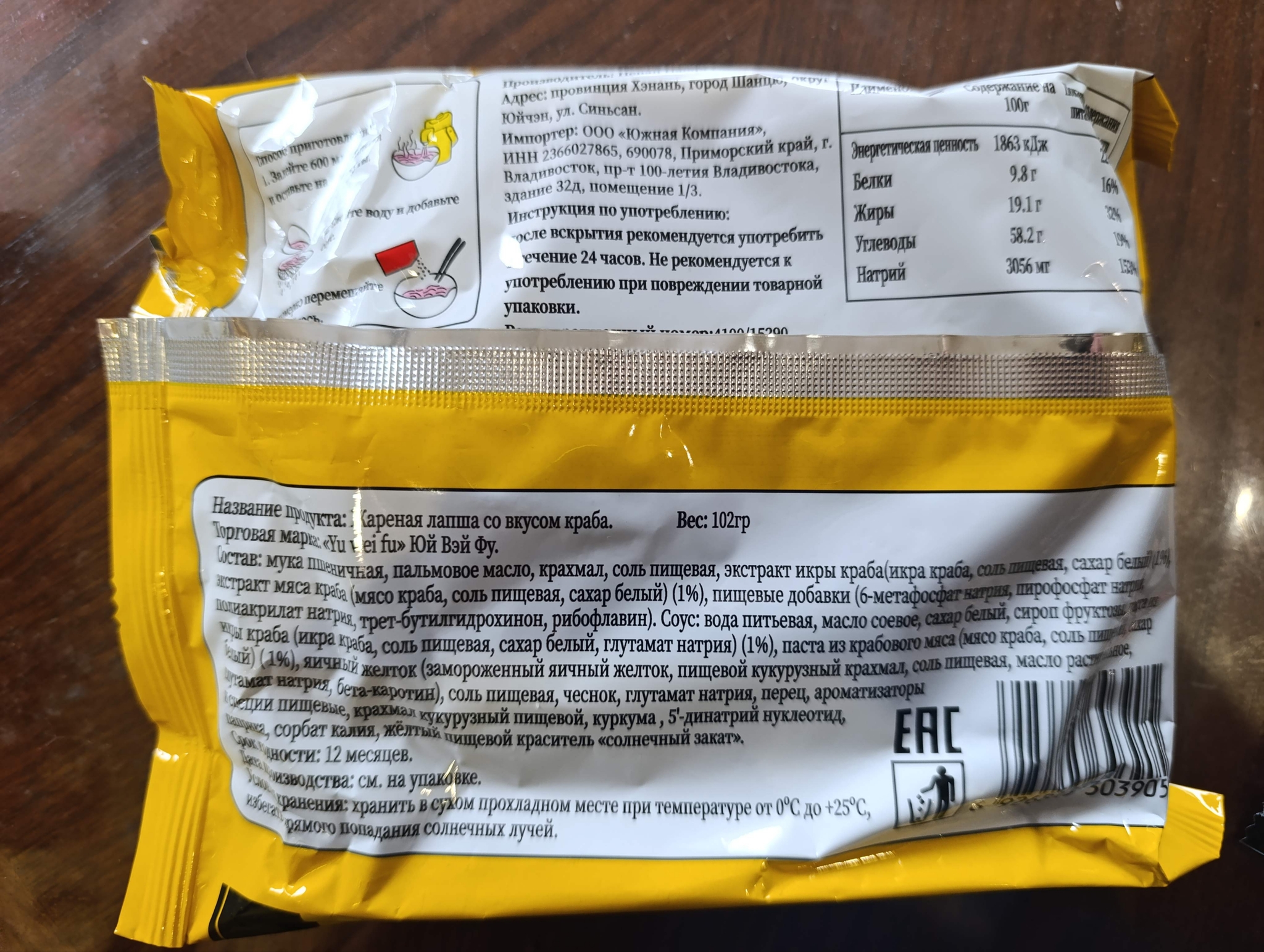 Производитель Yu wei fu обещает нам жареную лапшу со вкусом краба.