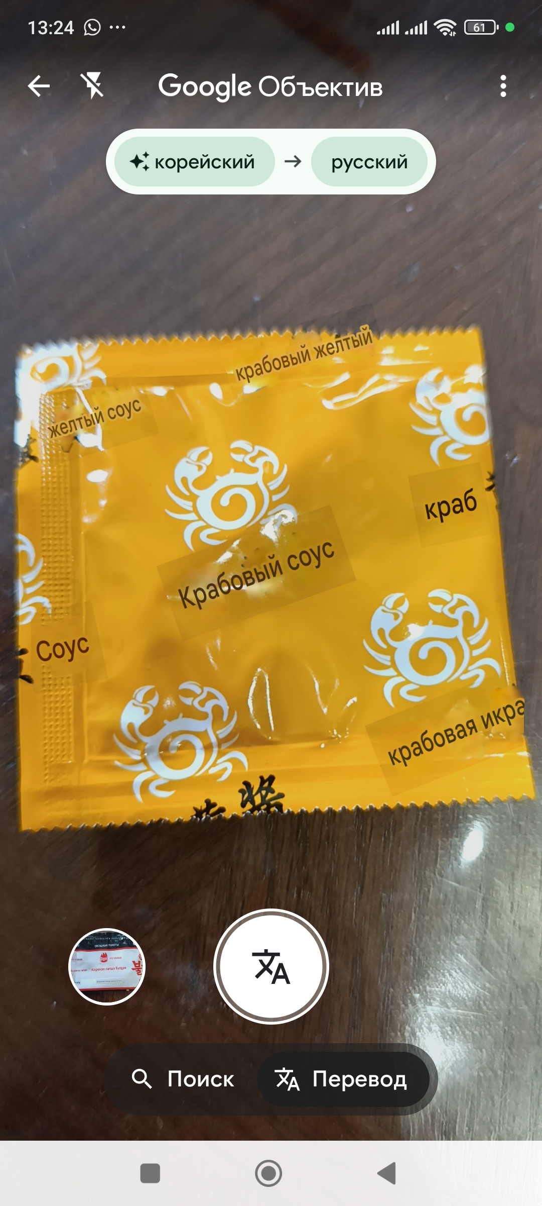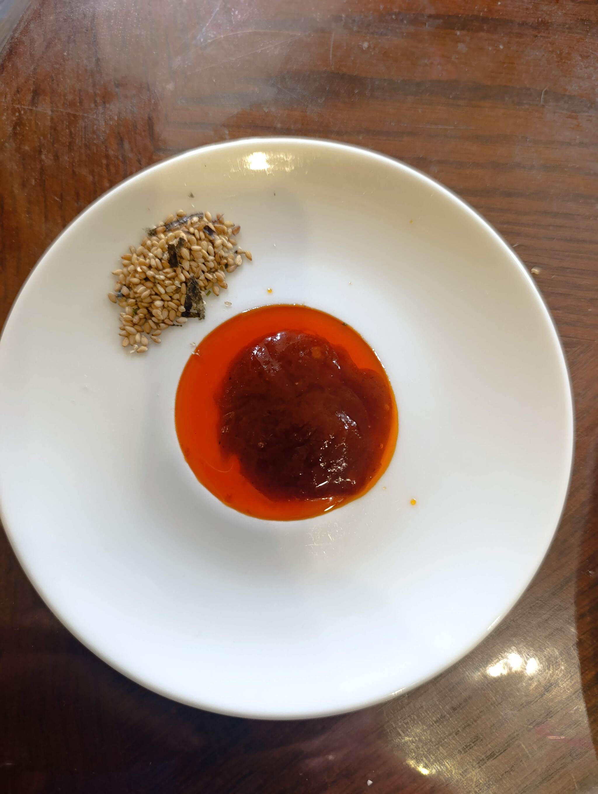 По факту в пакетах оказывается действительно крабовый соус (жирный, с отчетливым морским вкусом крабообразных, не очень острый) и совершенно неострый кунжут с нори во втором пакетике.
